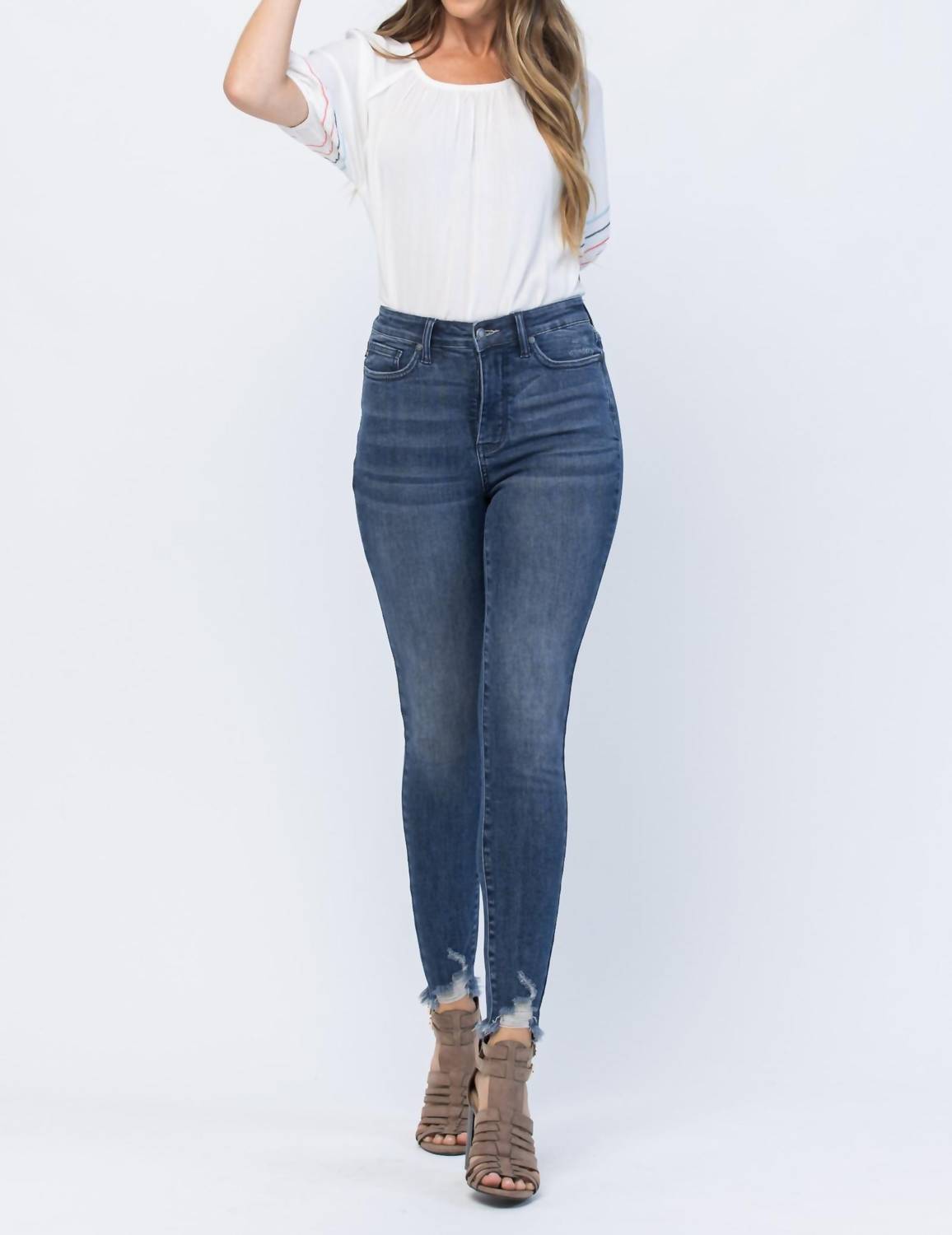 Effortless style and comfort in medium wash jeans. Offer a flattering high rise of 10.75" and a streamlined skinny leg design with a 27" inseam. Composed of 91% Cotton, 7% Polyester, and 2% Spandex. Provide a perfect blend of softness and stretch. Featuring a button closure and functional pockets.