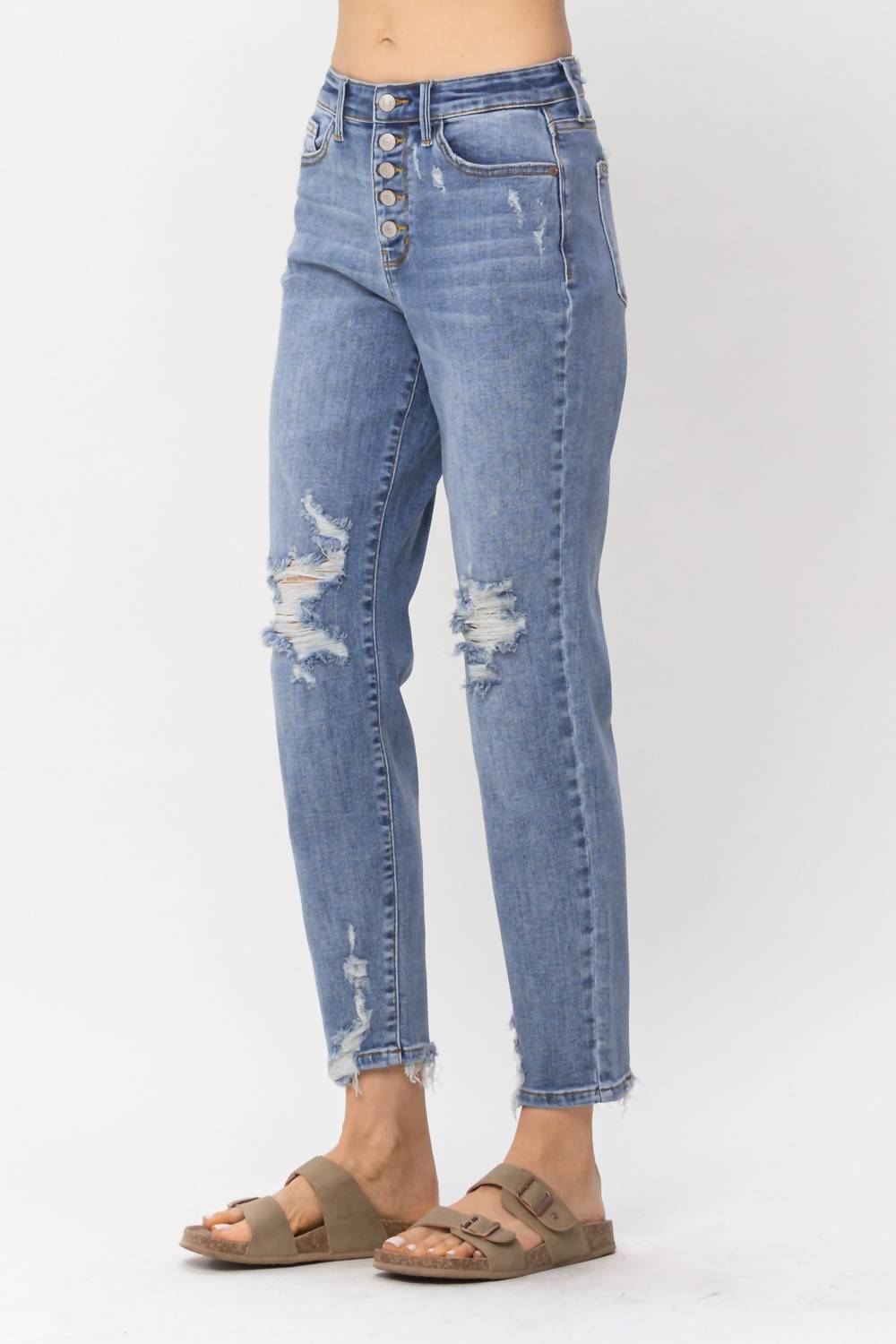 Judy Blue - High Waist Button Fly Destroyed Boyfriend Denim Jeans