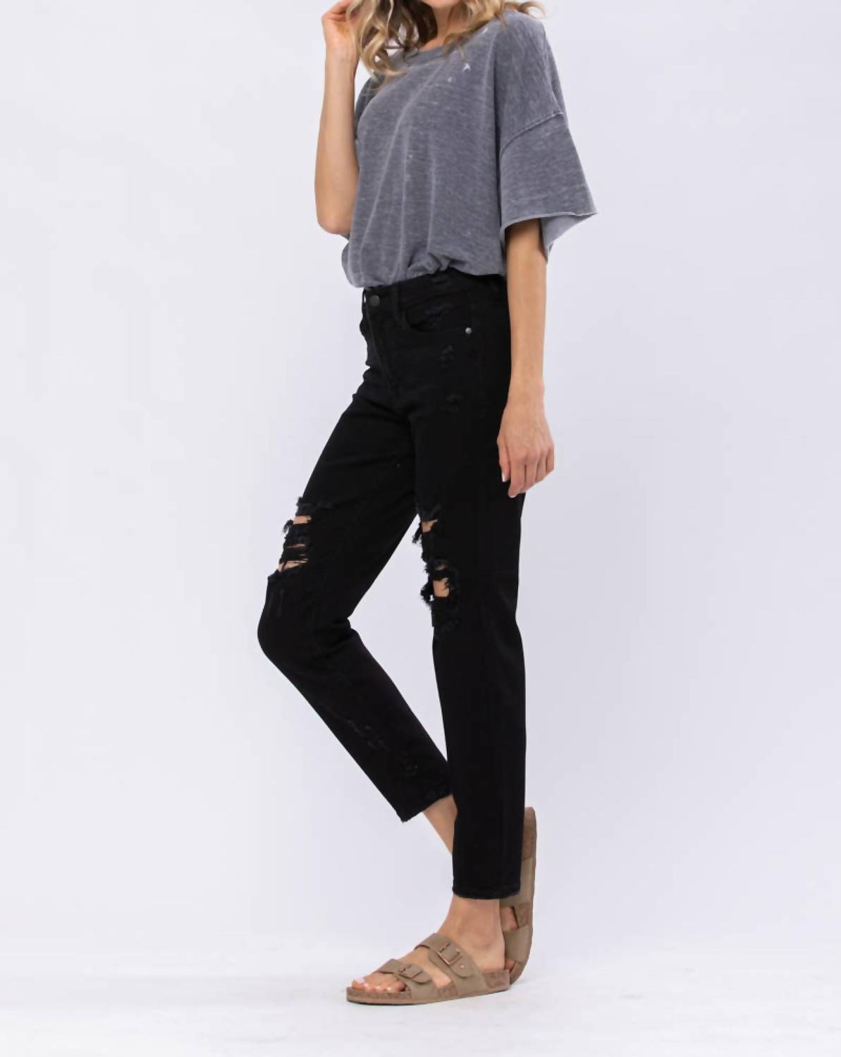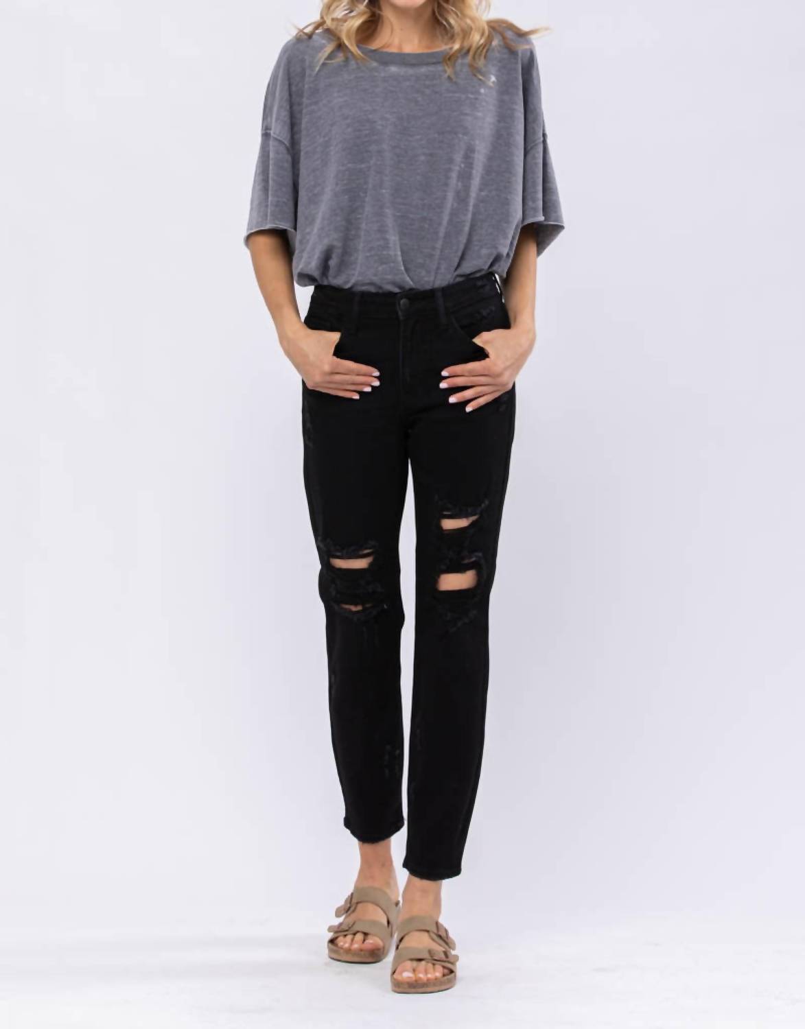 These boyfriend jeans make anything you pair them with look effortlessly cool. Introducing the Judy Blue High Waist Destroyed Boyfriend Denim Jeans, a must-have for those who love a relaxed yet stylish look for spring. Featuring a high waist design with a roomy boyfriend fit and straight leg style, these dark wash jeans are crafted from a cotton blend, including 65% Cotton, 21% Rayon, 11% Polyester, and 3% Spandex for comfort and flexibility. With a convenient button closure and pockets, these jeans provide both functionality and flair. Care: Turn inside out and wash in cold water, air dry or tumble on low, with a 28" inseam and a 10.5" front rise. Model is wearing a size 1 (5'8" height, 25" waist, 35" hip).