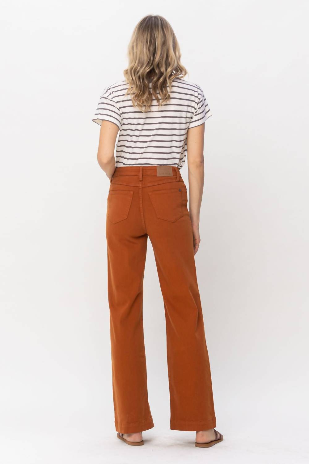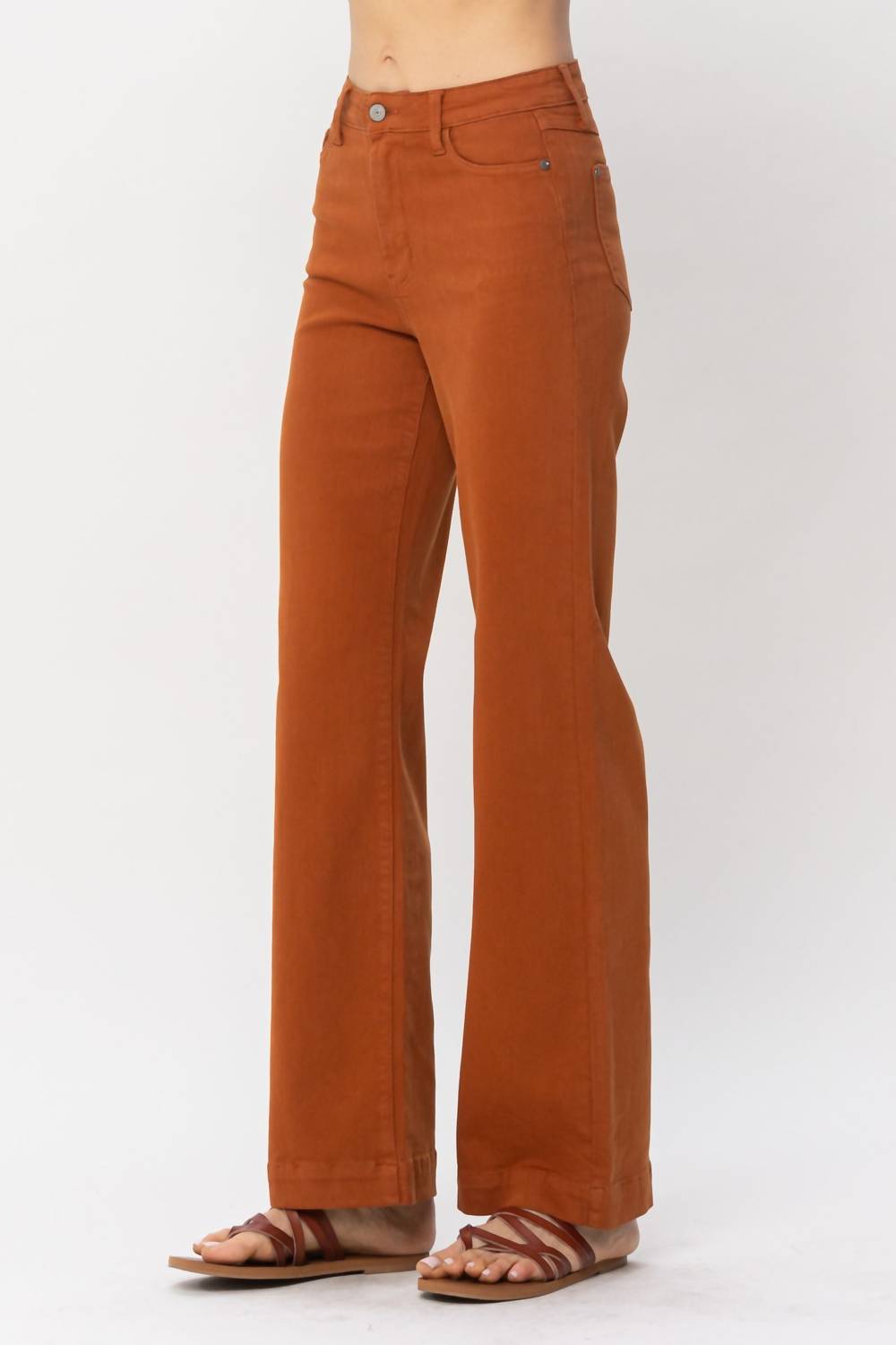 Introducing the High Waist Garment Dyed Wide Leg Denim Jeans by Judy Blue, perfect for embracing a relaxed, stylish look. With a composition of 93% Cotton, 6% Polyester, and 1% Spandex, these jeans offer a comfortable stretch in an eye-catching Auburn Orange. The wide leg design flares from mid-thigh to a generous opening, paired with a high front rise of 11" and a 32.5" inseam. Secure with a button closure, these jeans are best cared for by turning them inside out and washing in cold water, then air drying or tumbling on low. These jeans fit generously, so consider sizing down for the perfect fit.