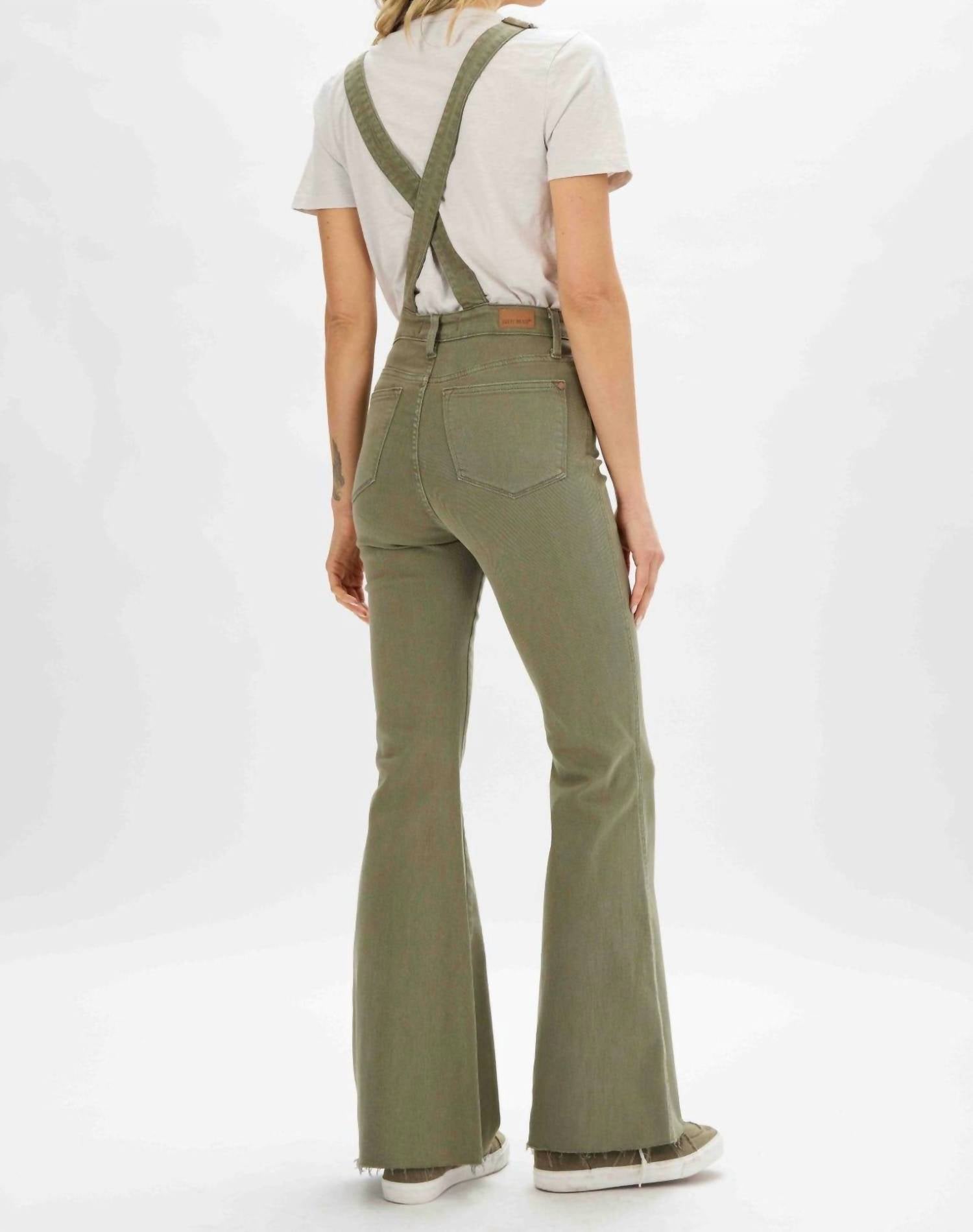Judy Blue High Waist "Control Top" Retro Flare Overall Denim (Model 88629) features a snug fit through the thigh with a flare from the knee. Made from 93% cotton, 6% polyester, and 1% spandex, it has a 33" inseam and an 11.5" front rise (size medium). Recommended to size down from your usual jean size. For care, wash inside out with cold water and air dry or tumble on low.