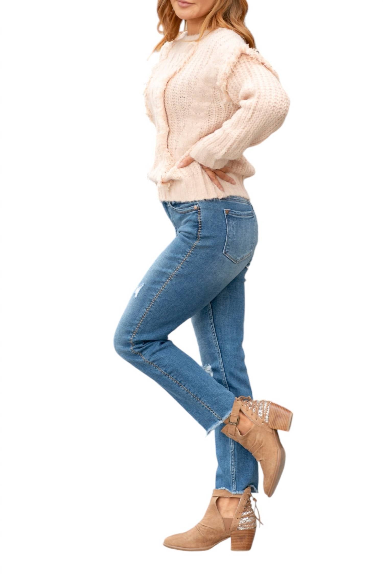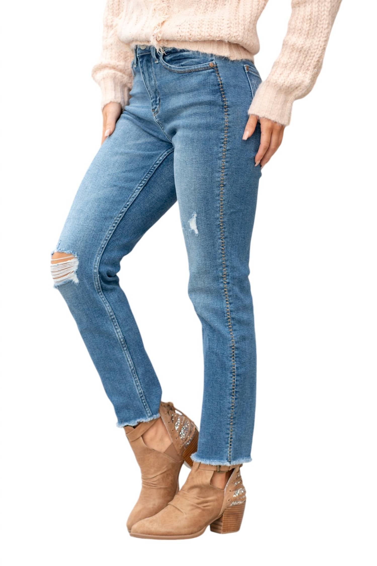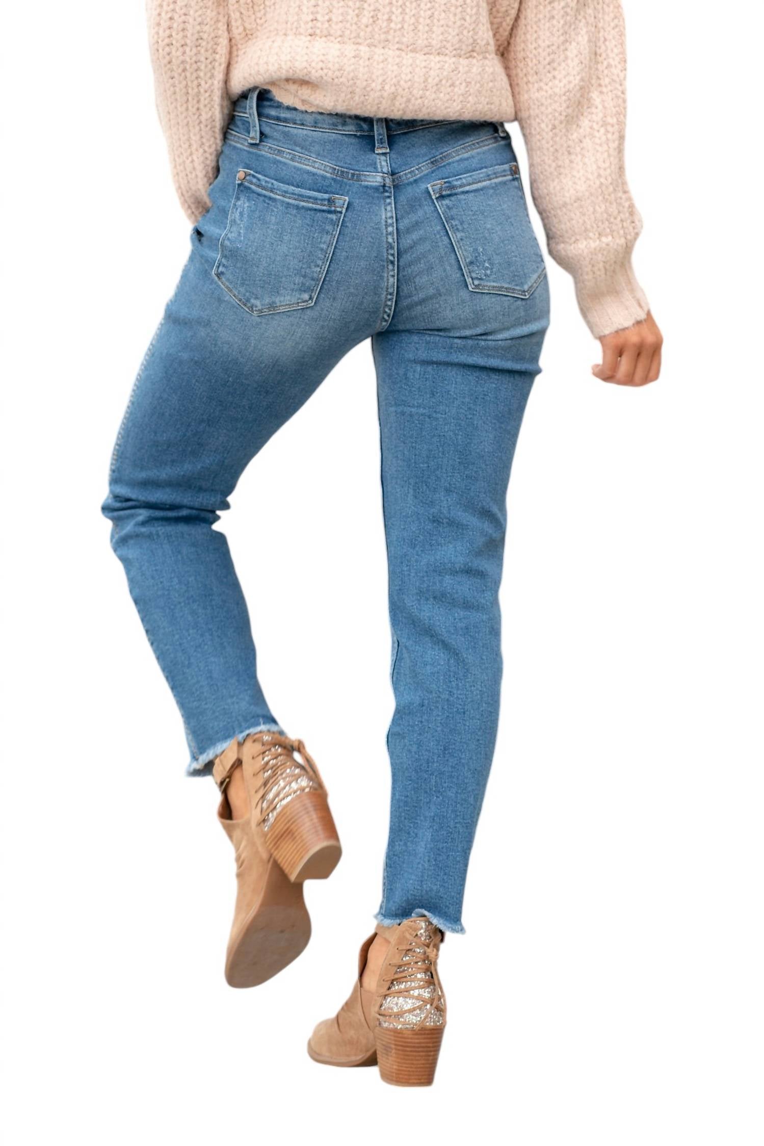 Fit to perfection, we love these high-waist jeans and you will too. Judy Blue jeans feature a high-rise boyfriend fit with thick-stitched side seams and a medium blue wash. They have a 28" inseam, are cuffed, and a 10.5" front rise. Made from 94% cotton, 5% polyester, and 1% spandex. Machine wash separately in cold water.
