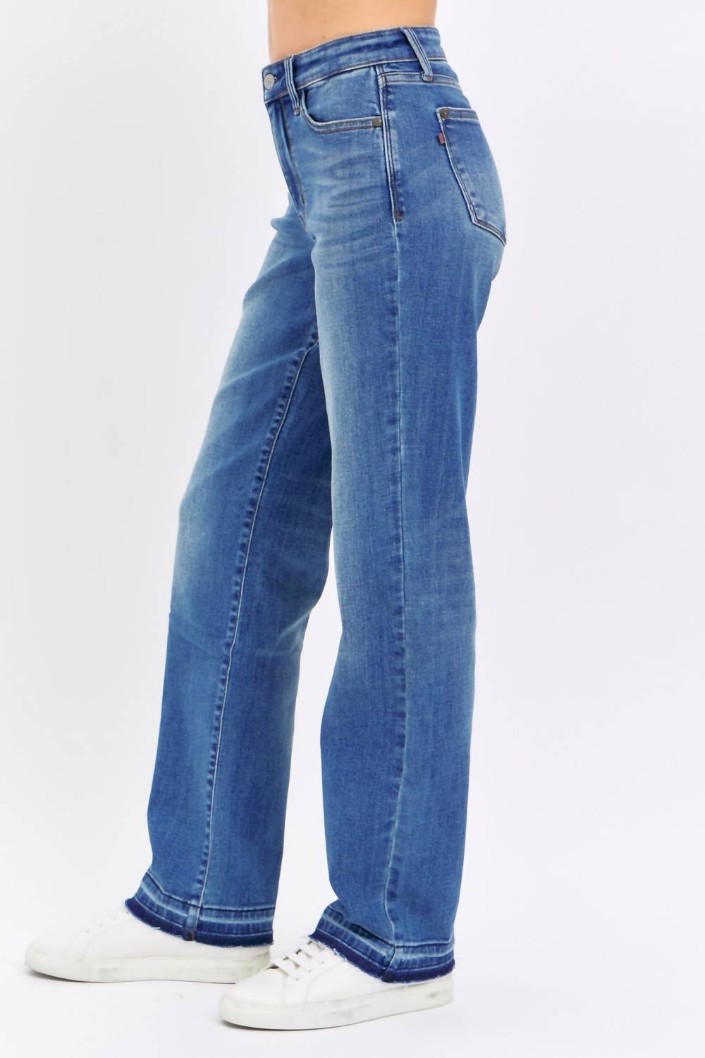 These must-have jeans are fit to perfection. Introducing the Mid Rise Dad Jean with Release Hem by Judy Blue, a chic addition to your wardrobe. These blue straight-leg jeans are crafted with 93% cotton, 6% polyester, and 1% spandex for a comfortable fit and feature a classic button closure. The medium wash denim has a 10" rise and a 32" inseam, offering a flattering silhouette with handy pockets. Care is simple with machine wash and tumble dry instructions, making it a perfect choice for both casual and special occasions.