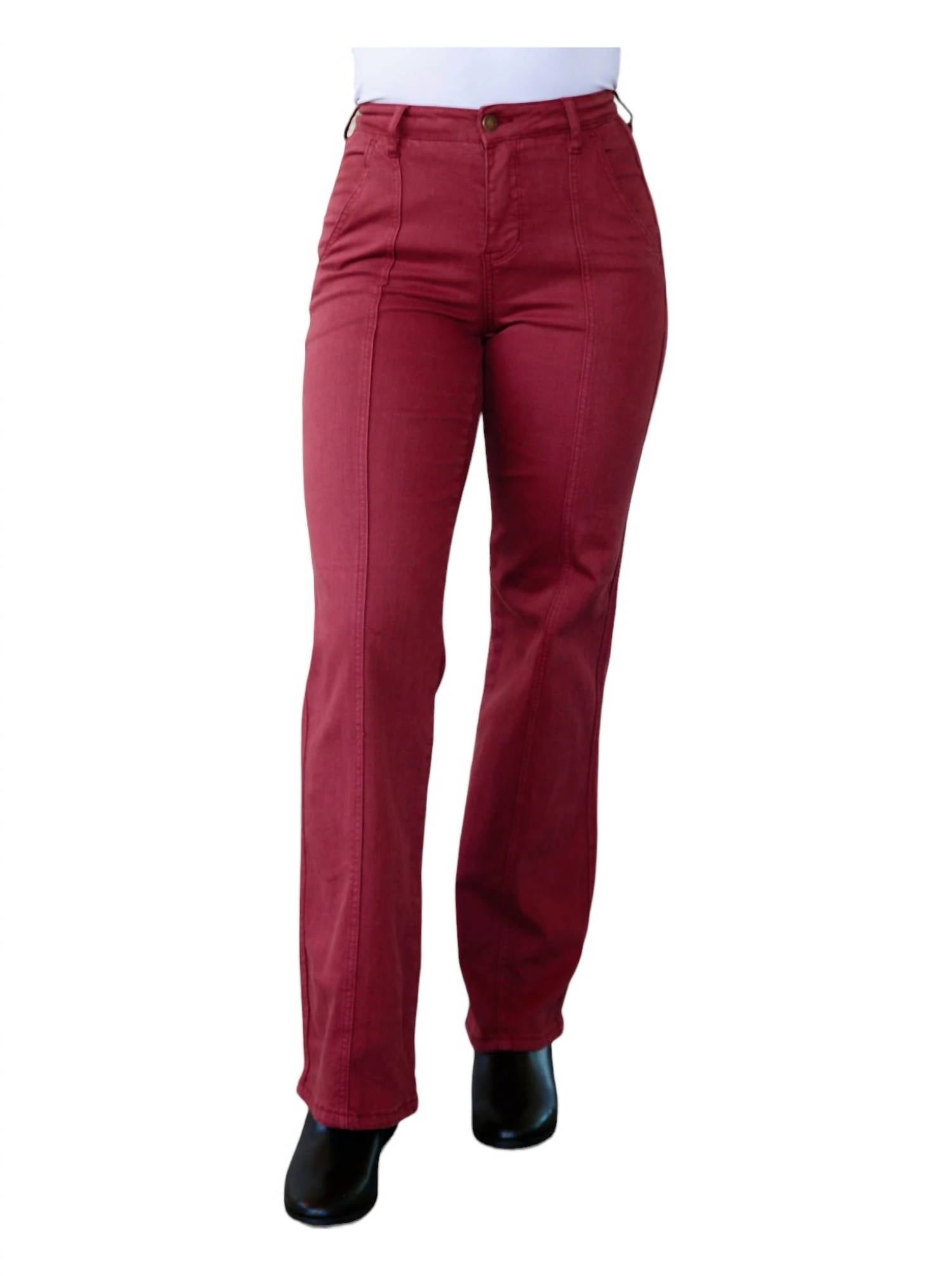 High rise. Zip fly. Garment dyed. Center front seam. Straight leg silhouette. 93% Cotton, 6% Polyester, 1% Spandex.