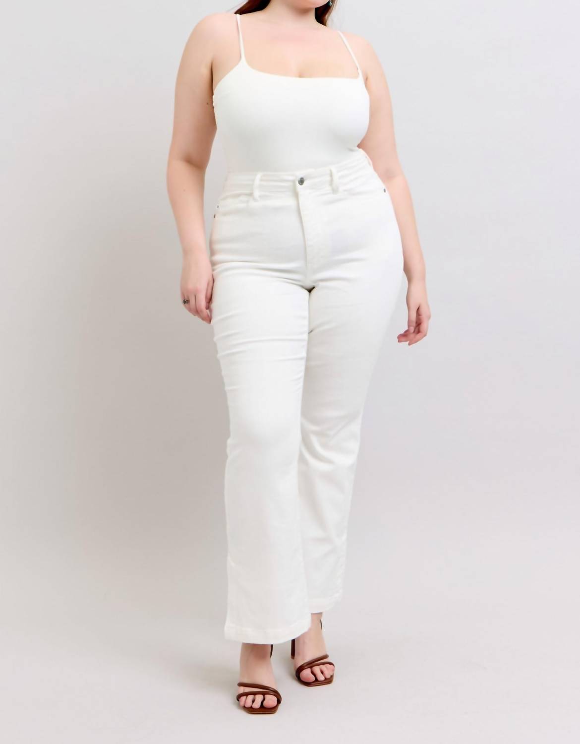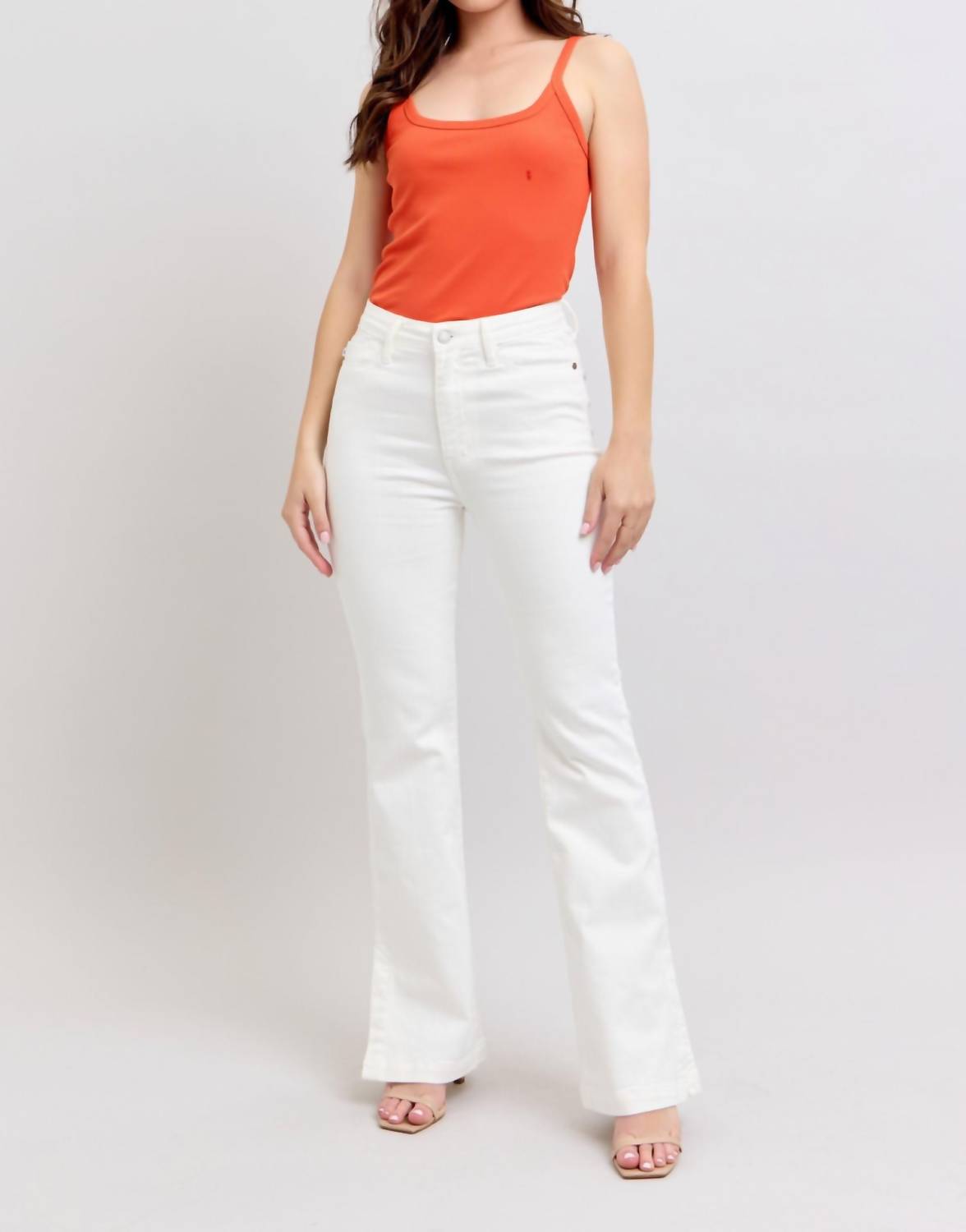 If you're looking for boot-cut, this is the jean for you. The Judy Blue Side Slit Slim Bootcut Jeans in white offer a relaxed fit with a high-rise waist, perfect for a minimalist spring look. Crafted from a cotton blend composed of 93% cotton, 6% polyester, and 1% spandex, these jeans feature a solid pattern and a stylish bootcut leg. With a convenient button closure, they include practical pockets for added functionality. Care for them easily with machine wash and tumble dry instructions, ensuring they stay in top condition. The regular fit model is 5'8" with a 25" waist and 36" hips wearing a size 1, while the plus model is 5'10" with a 36" waist and 50" hips, wearing a size 14W.