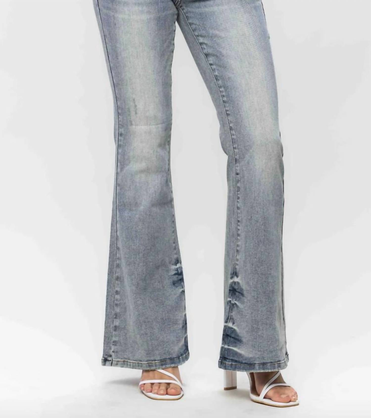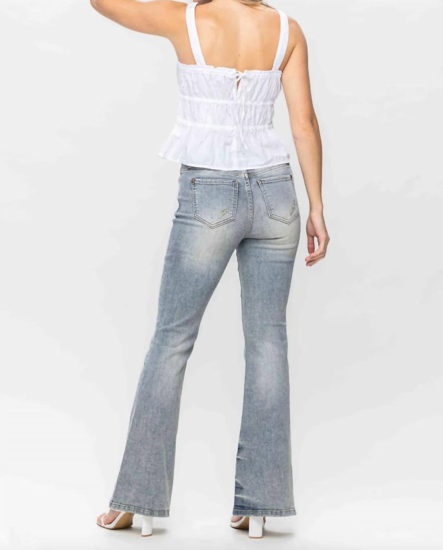 Just as cute as they are comfortable. Crafted for standout style. Boast a flared leg and mid rise, with a solid pattern that enhances their trendy streetwear appeal. Made from soft cotton. Feature a light wash and convenient button closure, ideal for travel occasions. Machine wash and tumble dry for easy care. With a rise of 9.5 inches and an inseam of 31 inches.