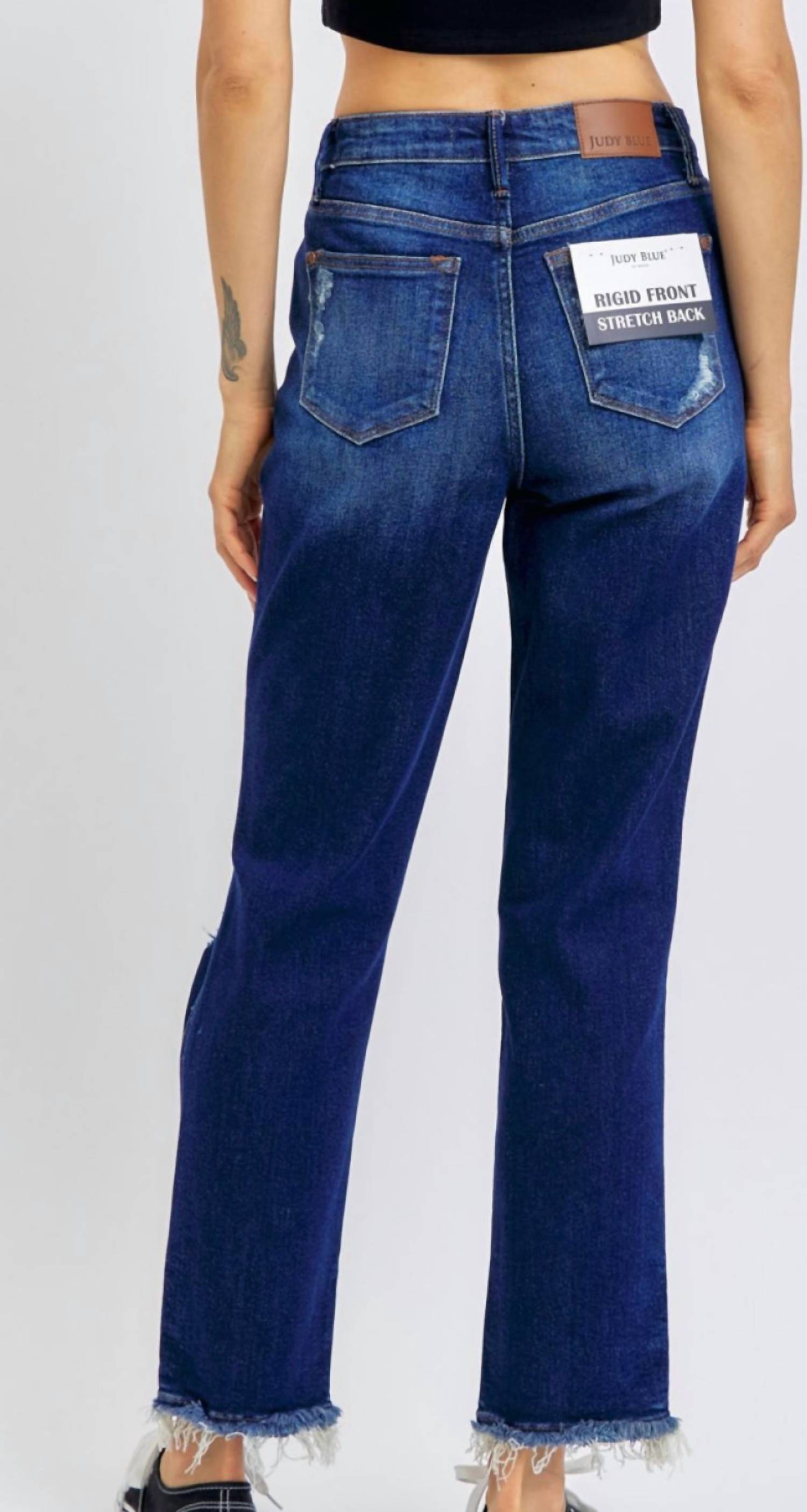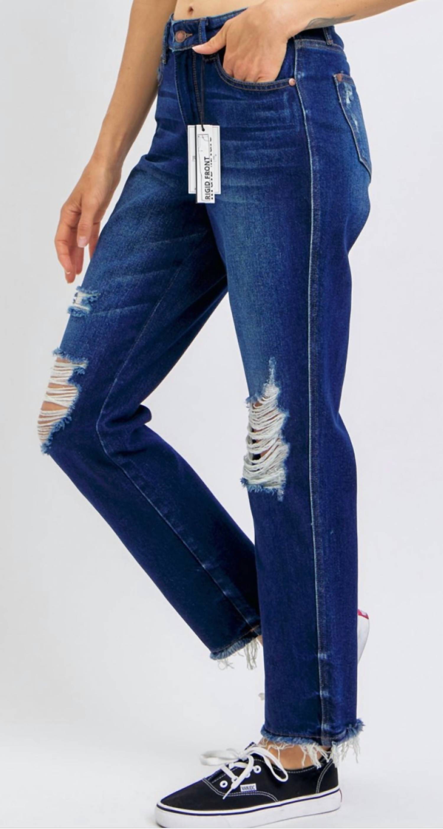 These must-have jeans are fit to perfection. Discover the Women's Straight Leg Jeans by Judy Blue, a must-have for your summer travel wardrobe. These denim jeans boast a classic fit with a mid-rise waist, and a zip closure provides easy wear. Designed with a stylish straight leg and a textured pattern, these dark wash jeans are suitable for a streetwear trend. Although the knees are destroyed and the hem is raveled, it features convenient pockets for practicality.