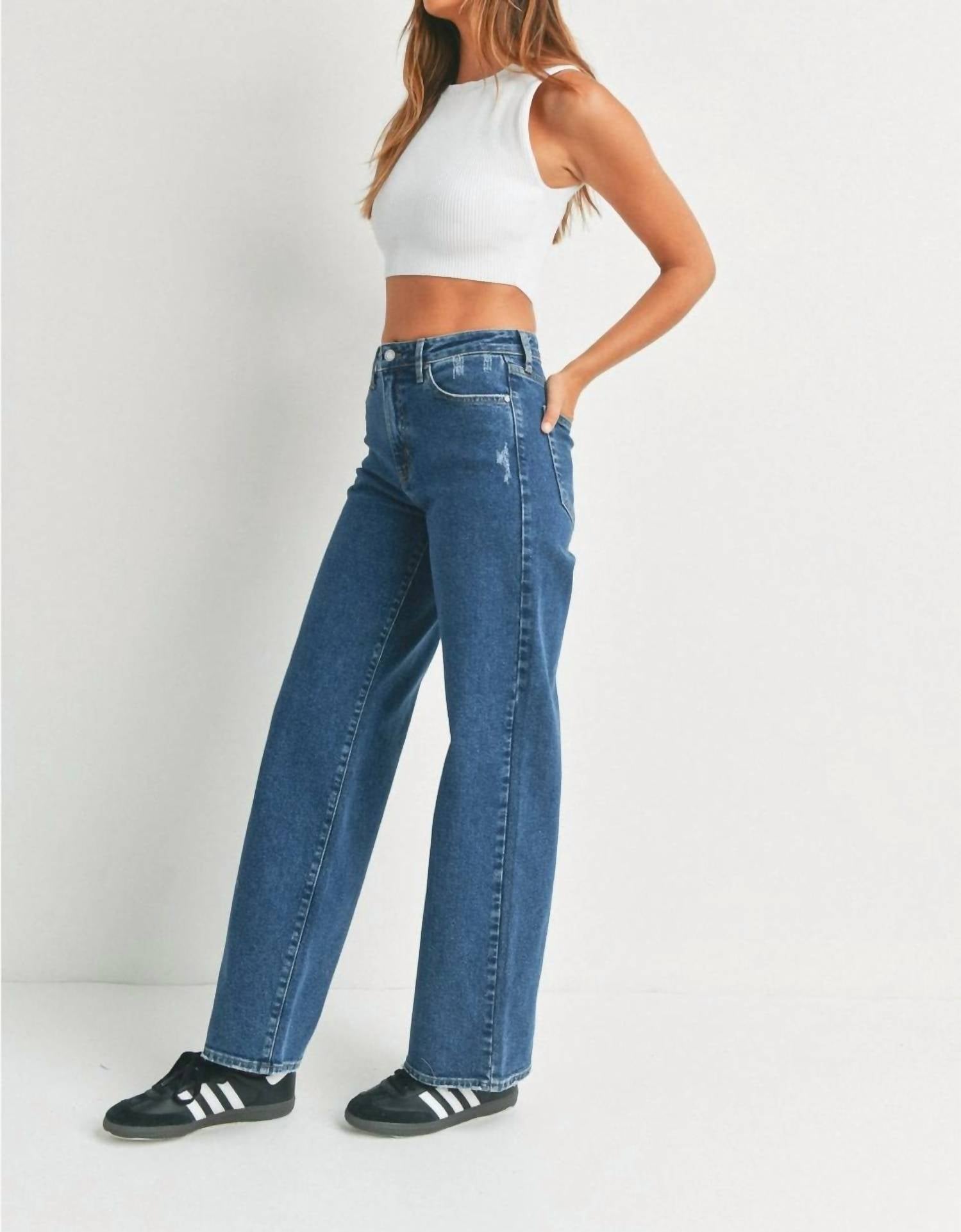 Pair these wide leg jeans with mules, slides or your favorite strappy sandals. Discover the Long High Rise Wide Leg Jeans by Just Black Denim, offering a chic silhouette in a dark wash for any wardrobe. These classic fit jeans feature a high rise with an 11" rise and a 32" inseam, crafted from a comfortable cotton blend that includes 96% Cotton, 3% Elasterell-P, and 1% Spandex for slight stretch. Made in the USA, they boast a wide leg style with clean hem and five pocket styling, closed with a button and zip. Ideal for a polished yet relaxed look, these jeans are a timeless addition to your collection.
