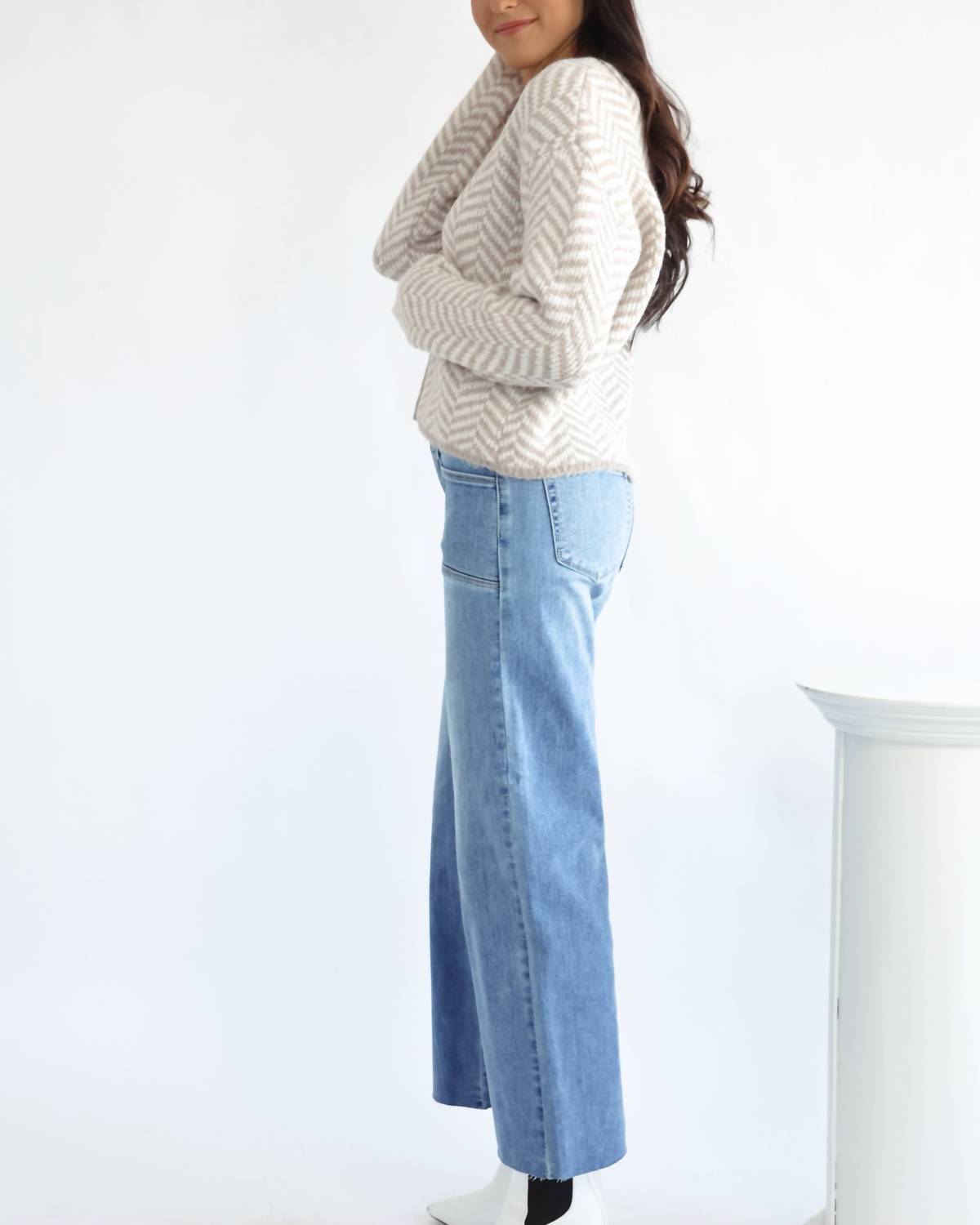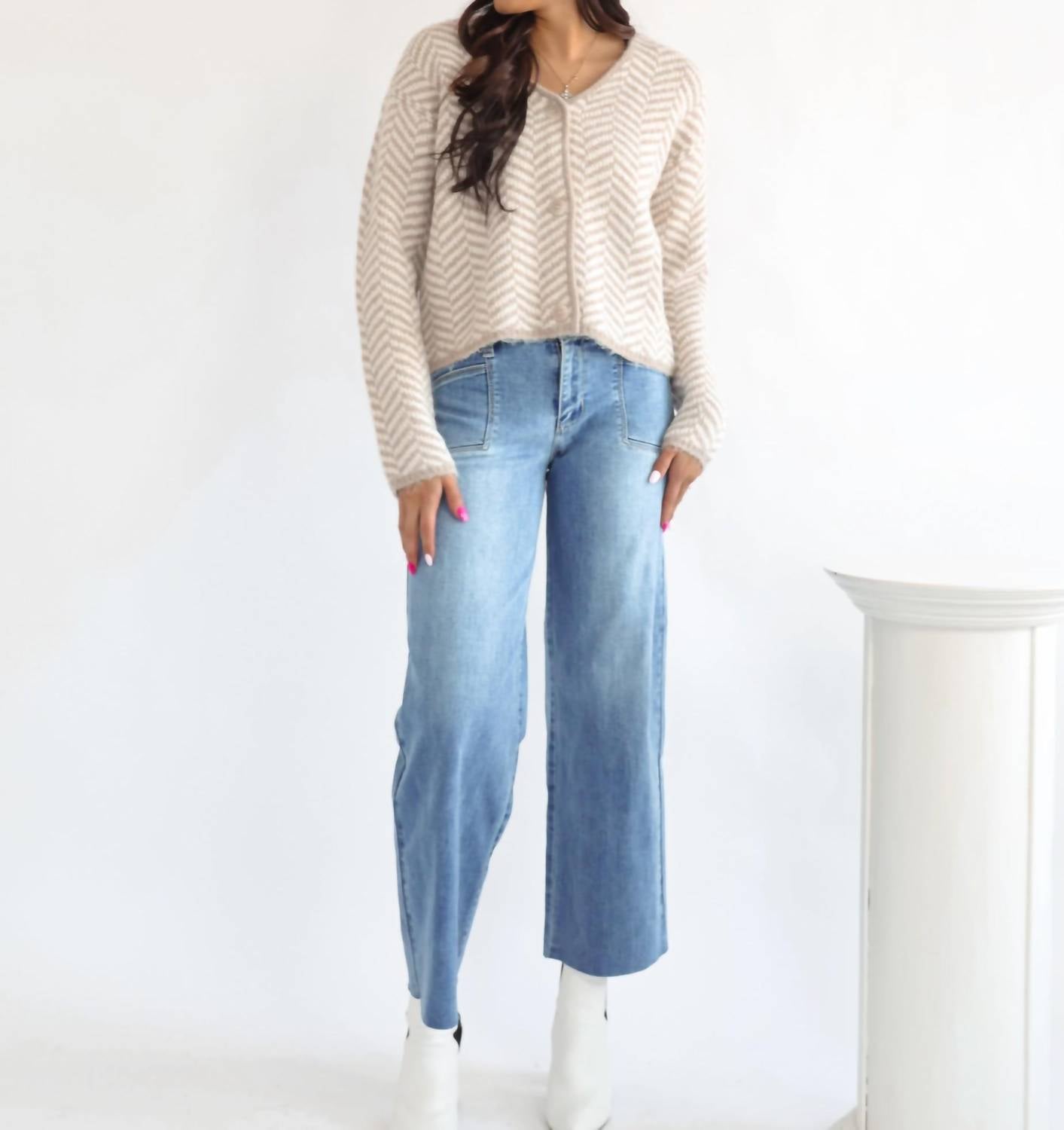 A flattering silhouette that's suprisingly versatile. Enhance your wardrobe with the Slim Wide Leg Jeans by JUST BLACK DENIM in a stylish medium wash. Made from denim, these high-rise jeans feature a relaxed fit with a statement wide leg and chic patch pocket detail. The raw hem adds a touch of edge, complete with a button closure. Model Hannah, standing at 5'8", wears her true size 25, ensuring a trendy yet comfortable fit.