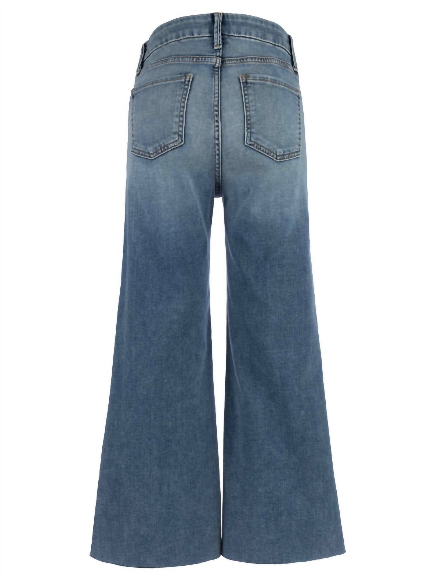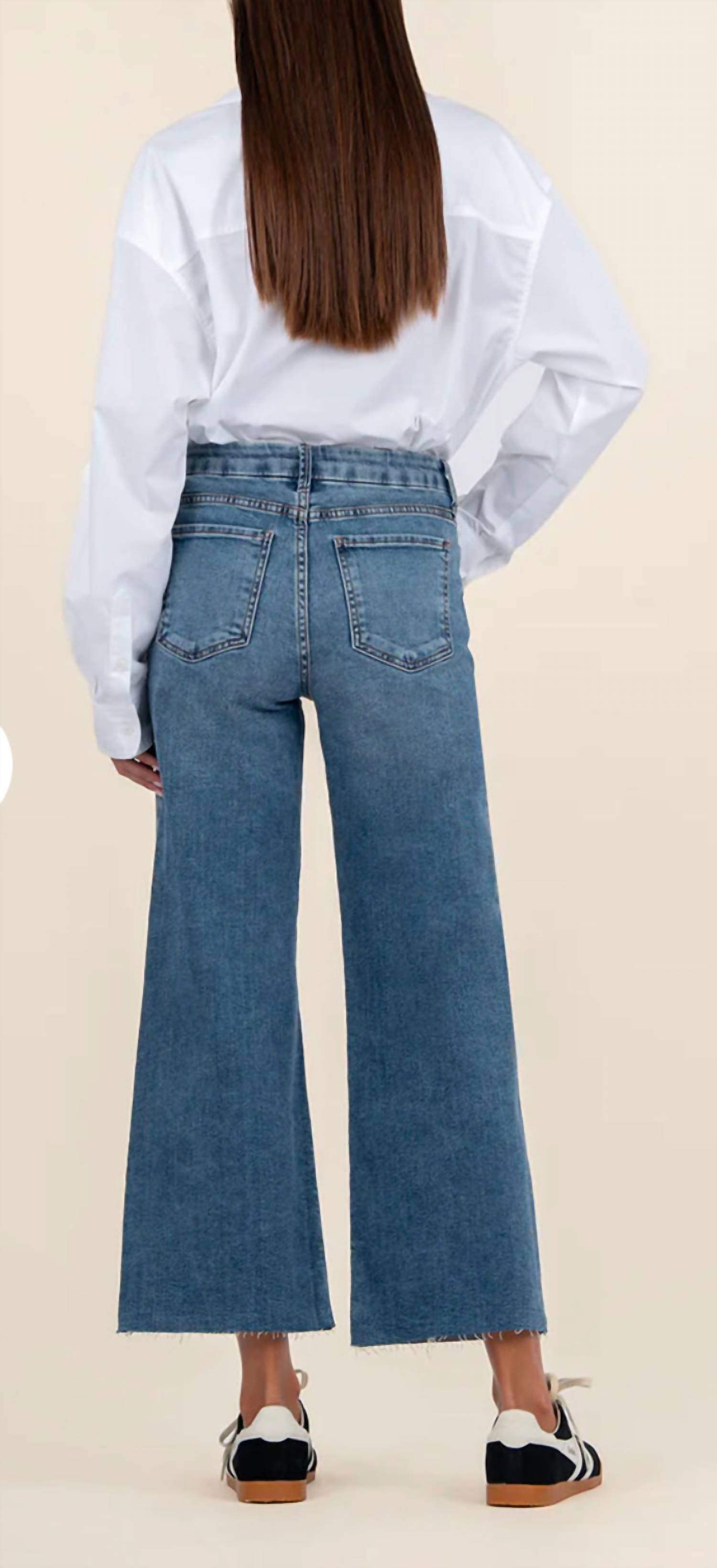 A flattering silhouette that's suprisingly versatile. Discover the Meg Wide Leg Denim Jeans by KUT FROM THE KLOTH, a must-have for effortless, casual style. These women's jeans are made with a comfortable cotton blend, featuring a high-rise and relaxed fit with a wide leg design for a timeless look. With an inseam of 27 inches, a leg opening of 23 inches, and a rise of 10.5 inches, these jeans offer a flattering silhouette. Closure: Tie closure. Care Instructions: Machine wash and tumble dry. Ideal for a grunge fall look at a music festival, particularly around Thanksgiving.