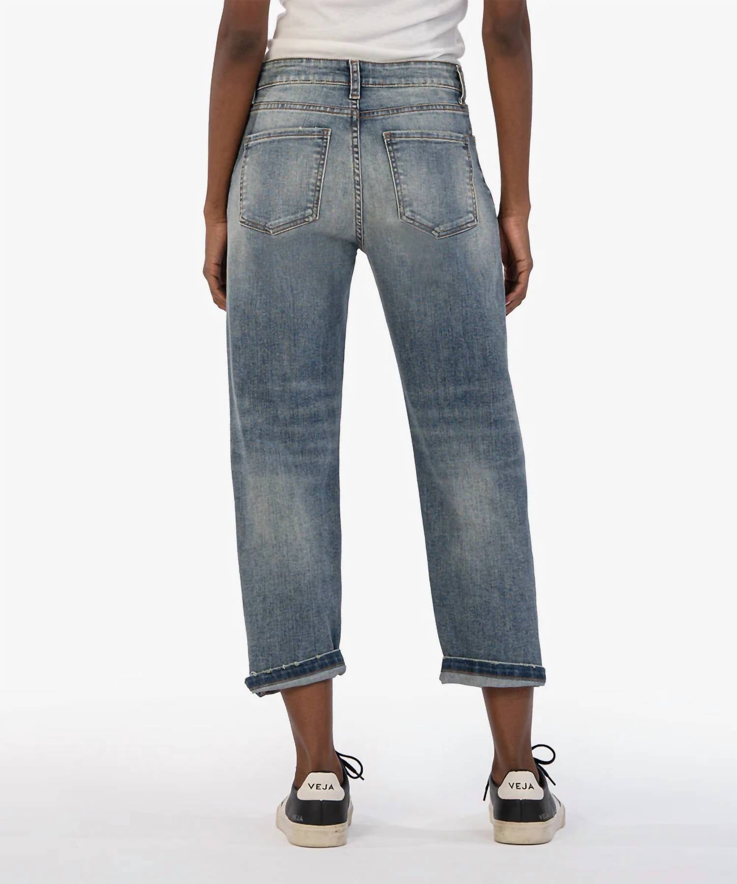 a laid-back feel while still surprisingly form-flattering. Experience laid-back style and comfort. Made from a stretch denim blend of 74% Cotton, 24% Polyester, and 2% Lycra. Showcase a stylish faded and whiskered look in Shaped Wash. Feature a high-rise waist with a 25.5" inseam after roll-up, an 11" rise, and a 14.5" leg opening. Designed for a true-to-size fit. Come with button closure. Machine wash and tumble dry low instructions.