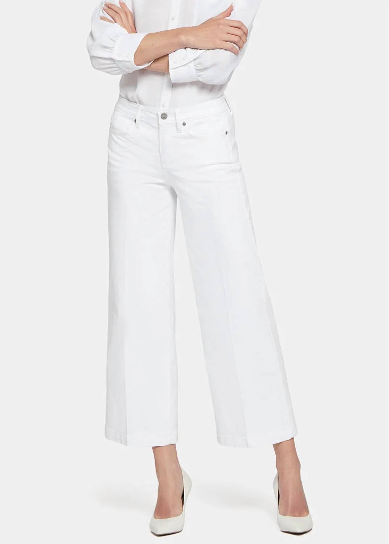 A flattering silhouette that's suprisingly versatile. Discover the Teresa Wide Leg Ankle Jeans by NYDJ, a stylish piece in optic white perfect for adding flair to your wardrobe. These jeans, crafted with 88% Cotton, 10% Polyester, and 2% Elastane, feature a wide leg silhouette enhanced by five-pocket styling for a classic touch. Zip fly with button closure. Machine wash cold and line dry. Made with eco-friendly methods and featuring Lift Tuck® Technology for a flattering fit.