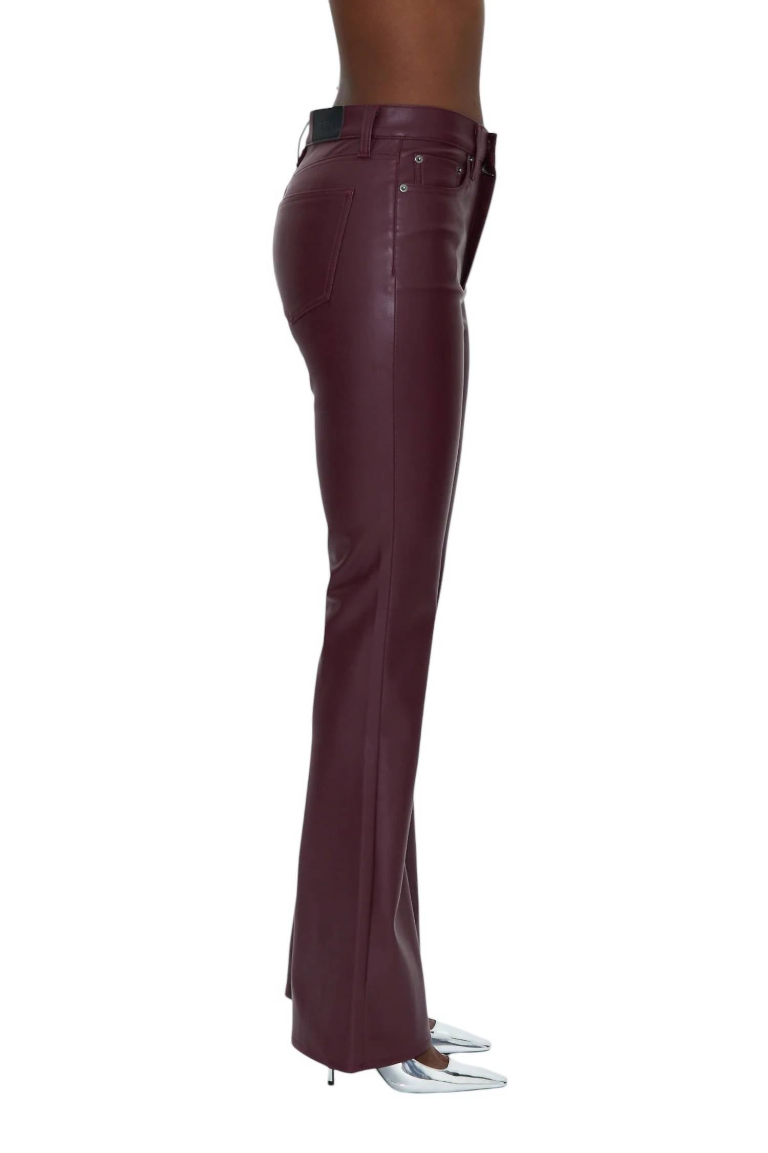 Introducing the Dana High Rise Boot Jeans by PISTOLA, designed for those who appreciate a subtle yet impactful silhouette. These burgundy pants in buttery soft 100% Polyurethane provide a refined take on the traditional boot cut, featuring a high-rise waist and a slight flare at the leg opening, measuring 19 inches. This solid pattern exudes effortless style, with a rise of 11.5 inches and an inseam of 32.5 inches, perfectly modeled by someone who's 5’9” wearing size 26. Closure is secured with a button, promising both comfort and chic appeal.