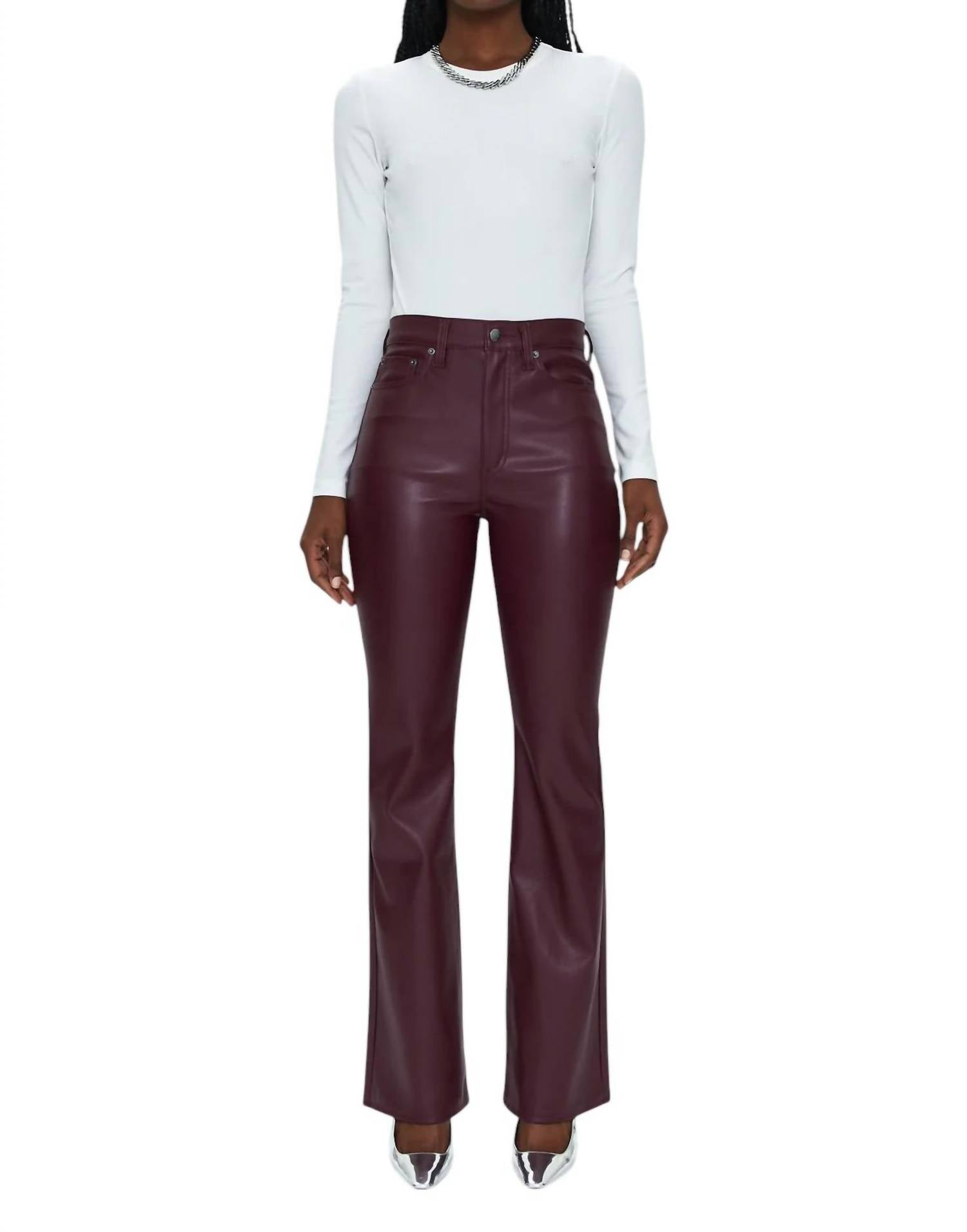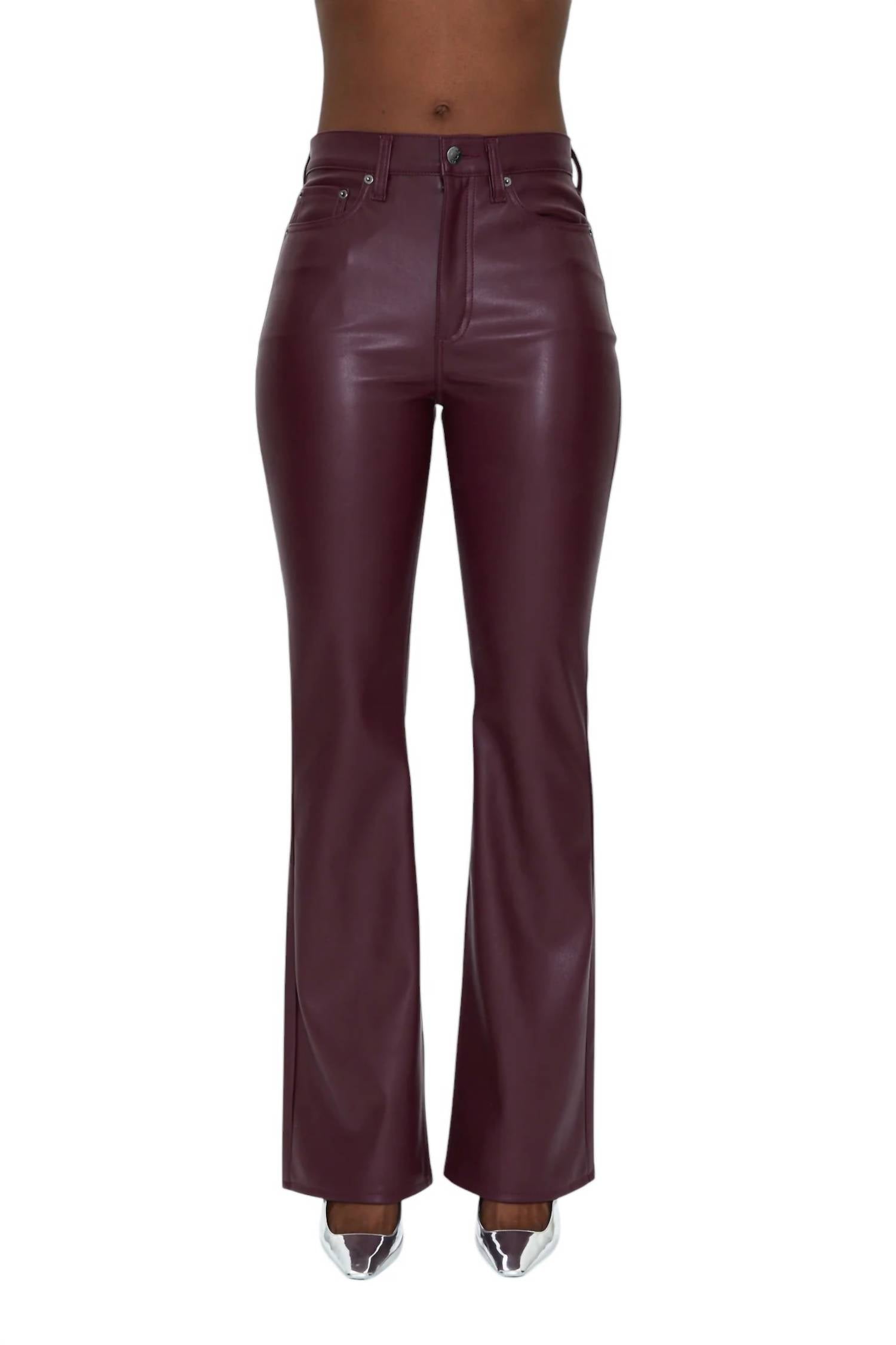 A boot-cut jean that not only looks good on, you'll be comfortable in them all day. Introducing the Dana High Rise Boot Jeans by PISTOLA, designed for those who appreciate a subtle yet impactful silhouette. These burgundy pants in buttery soft 100% Polyurethane provide a refined take on the traditional boot cut, featuring a high-rise waist and a slight flare at the leg opening, measuring 19 inches. This solid pattern exudes effortless style, with a rise of 11.5 inches and an inseam of 32.5 inches, perfectly modeled by someone who's 5’9” wearing size 26. Closure is secured with a button, promising both comfort and chic appeal.