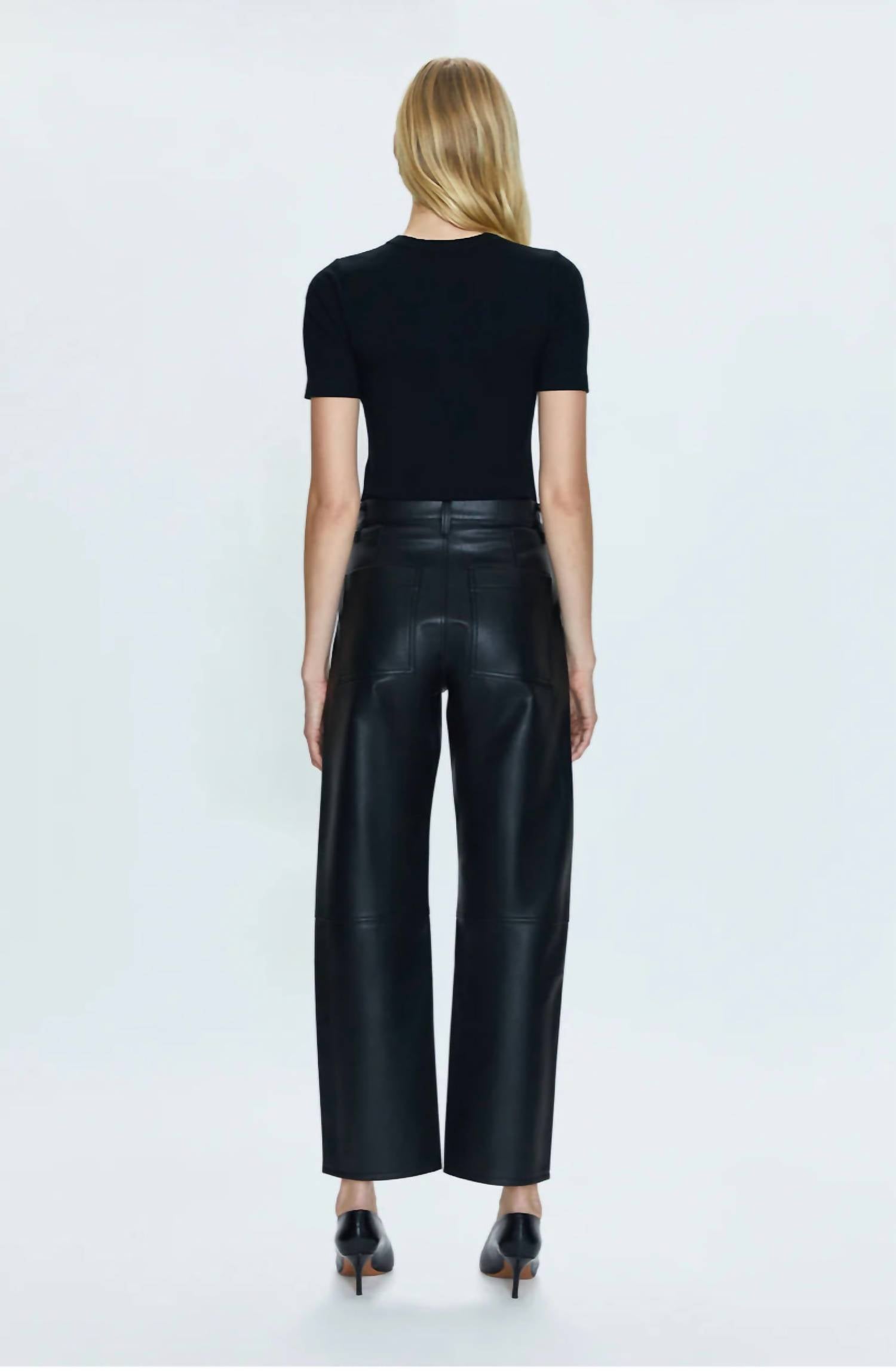 Discover the Taylor Bowed Straight Jeans by PISTOLA, offering a sleek and modern silhouette in vegan leather slate black fabrication. Crafted from 100% Polyurethane with a relaxed fit and straight leg style, these jeans embody both comfort and style. Featuring a high rise design, front seaming to add visual interest, and a clean ankle-length hem. Closure is a convenient zip, with practical pockets to complete the look. Ideal for those seeking a bold, solid-colored statement piece.