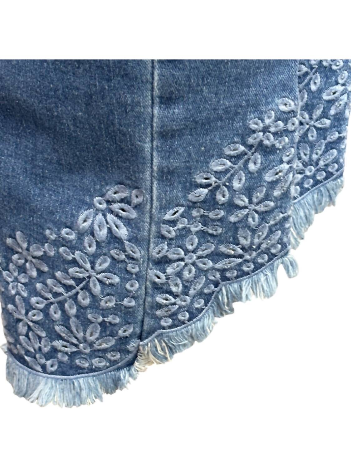 We especially love this cropped jean with a cute pair of slides or sandals. Discover the Embroidered Scallop Hem Jean by Slimsation By Multiples, a perfect blend of comfort and style in Medium Indigo. These high-rise, flared leg jeans are made from cotton and feature a unique patterned design. With real front and back pockets, this pull-on style offers convenience and a trendy look. Care: Machine wash for easy maintenance.