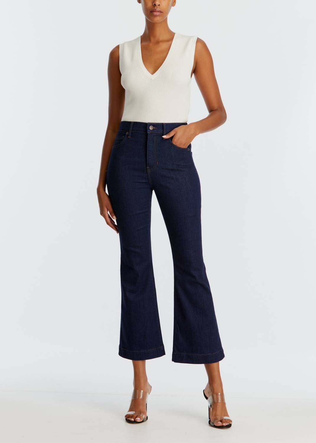 Pair these wide leg jeans with mules, slides or your favorite strappy sandals. Introducing the Carson Ankle Flare Jeans by Veronica Beard, a stylish choice in an indigo rinse for your spring wardrobe. These high-rise jeans feature a classic kick in the hem and a solid pattern, crafted from a comfortable cotton blend composed of 92% cotton, 6% elastomer, and 2% elastane. Made in LA, they run small, so consider sizing up for the perfect fit. Closure type: Button closure.