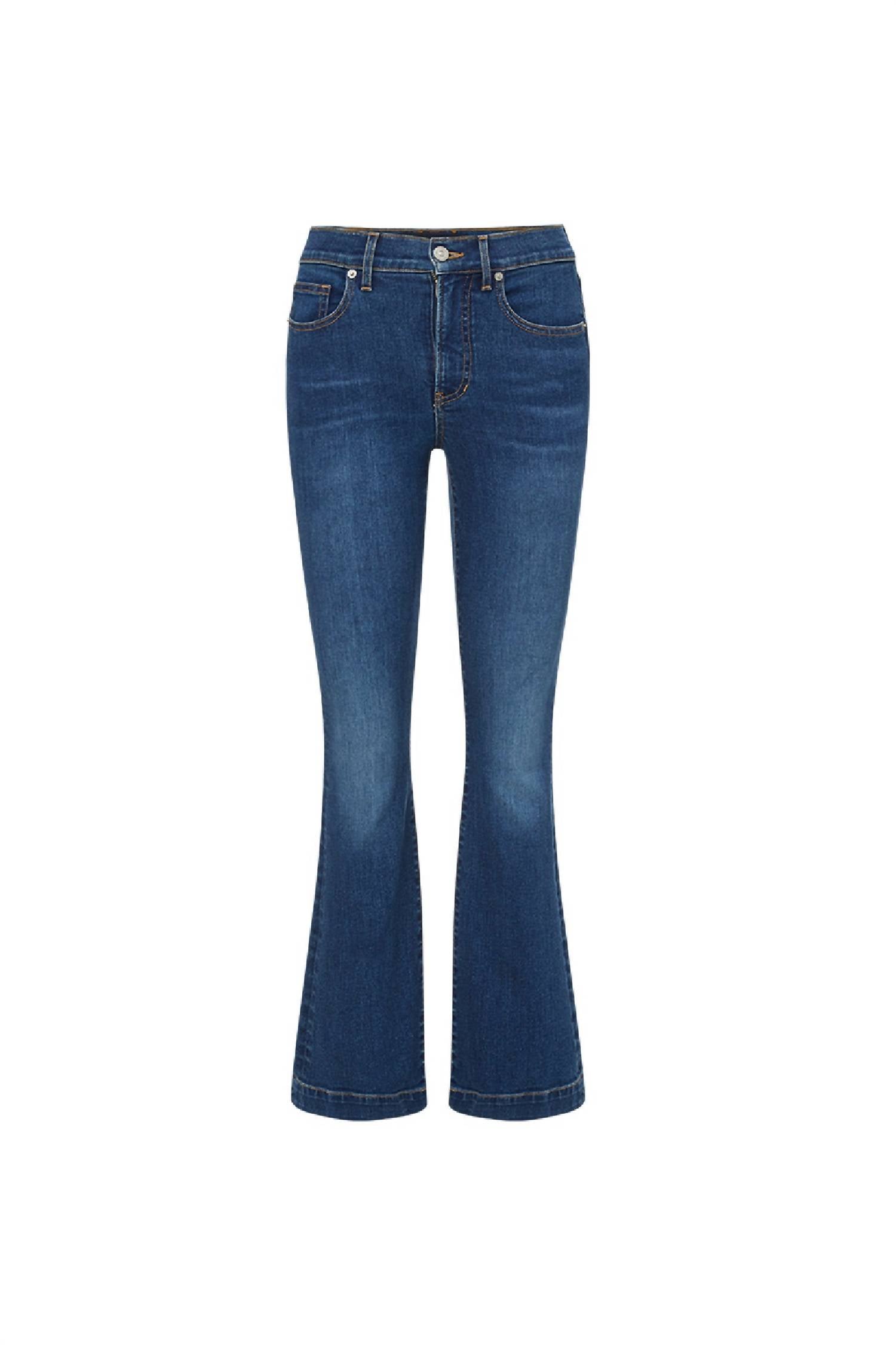 Just as cute as they are comfortable. Introducing the Carson Ankle Kick Flare Jean by Veronica Beard, a chic high-rise silhouette crafted from a premium cotton blend denim in vibrant bright blue. Made in LA with a flattering flared leg design, these jeans feature a slim fit through the hips and thighs, complete with practical pockets. Composition: 92% Cotton, 6% Elastomer, 2% Elastane. Closure: Button closure. Care: Turn inside out and machine wash cold, hang to dry. Dimensions for size 26 include a rise of 11", inseam of 28", and leg opening of 19". Perfectly paired with casual or dressed-up styling, this piece promises versatility and comfort.
