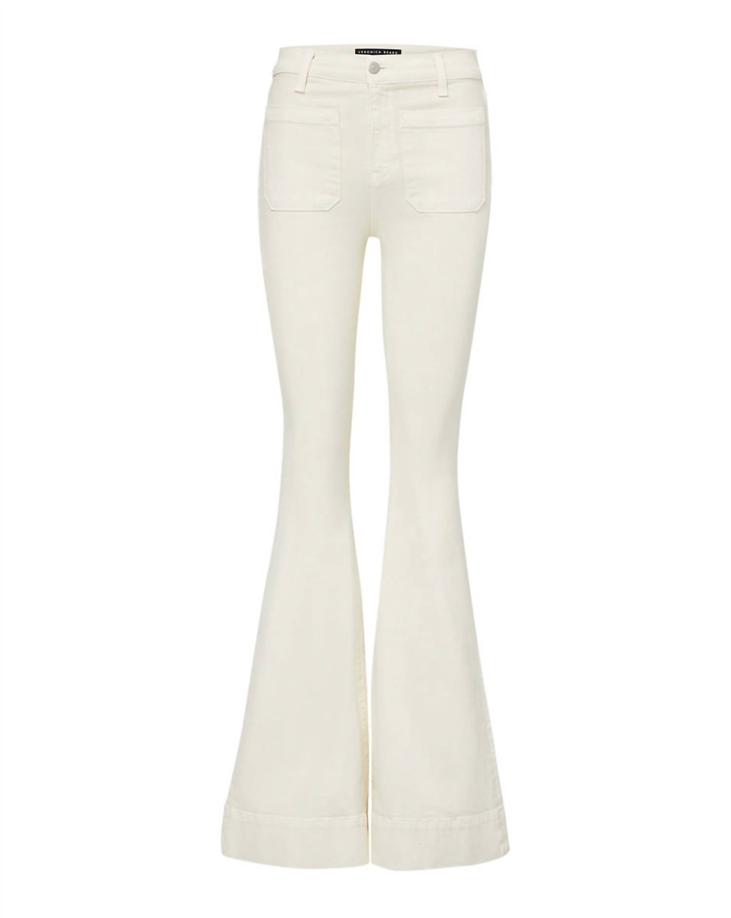 A flattering silhouette that's suprisingly versatile. Patch pockets and high-rise to the bell-bottom silhouette. Flattering fit and a quick recovery. Rise 11" | Inseam 35" | Leg opening 26". Model is 5'10 and is wearing a size 26. Machine wash on cold.