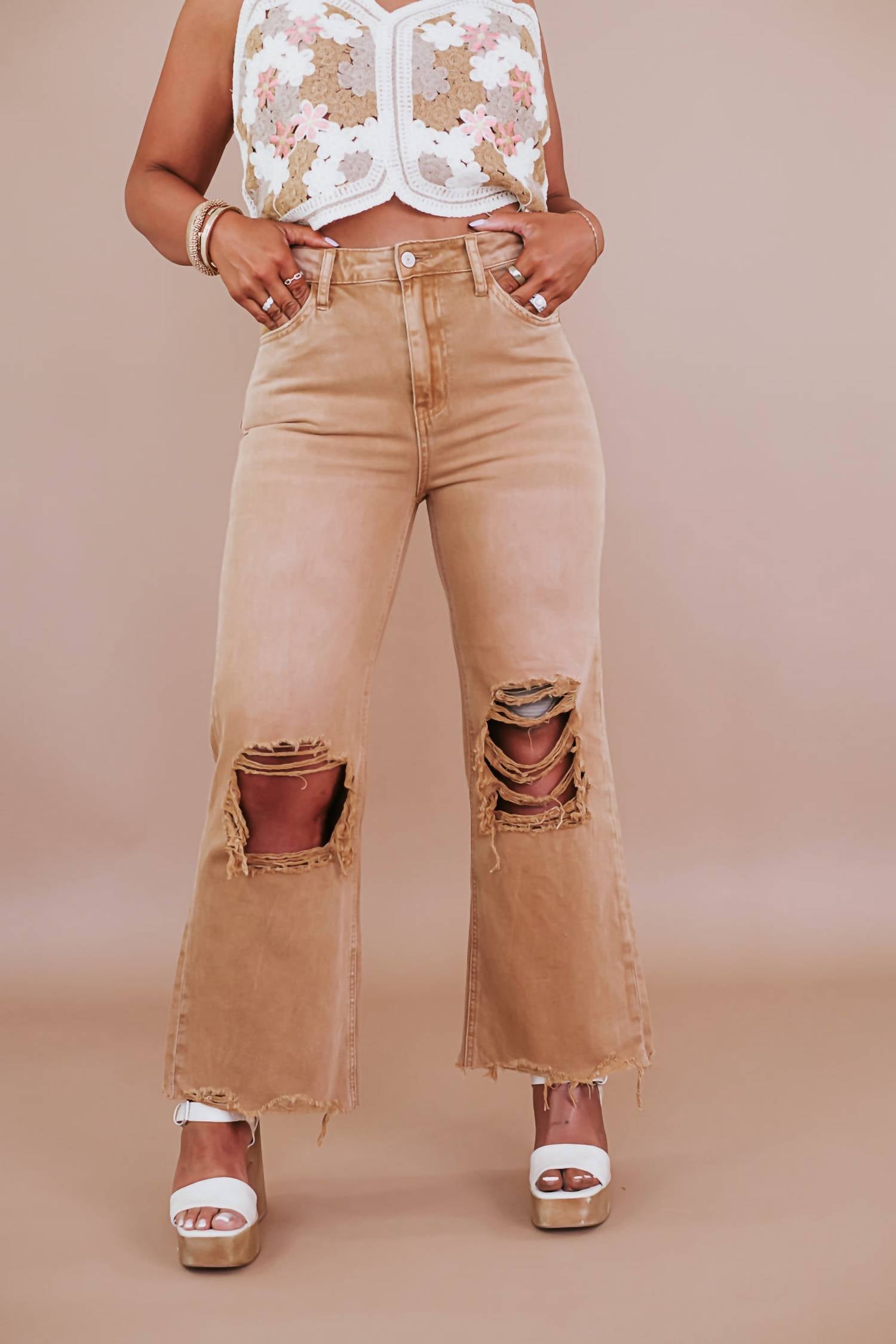 Pair these wide leg jeans with mules, slides or your favorite strappy sandals. The Brooks Distressed Jean from VERVET BY FLYING MONKEY is a chic nod to '90s fashion, designed in the Kiss Of Cali solid shade. Featuring a relaxed fit with flared legs, these jeans boast an ultra high rise of 11 1/2 inches and a cropped inseam of 27 inches. Made from 100% cotton, they offer a button closure and pockets for added functionality. Perfectly suited for spring, these jeans are best maintained with machine washing.