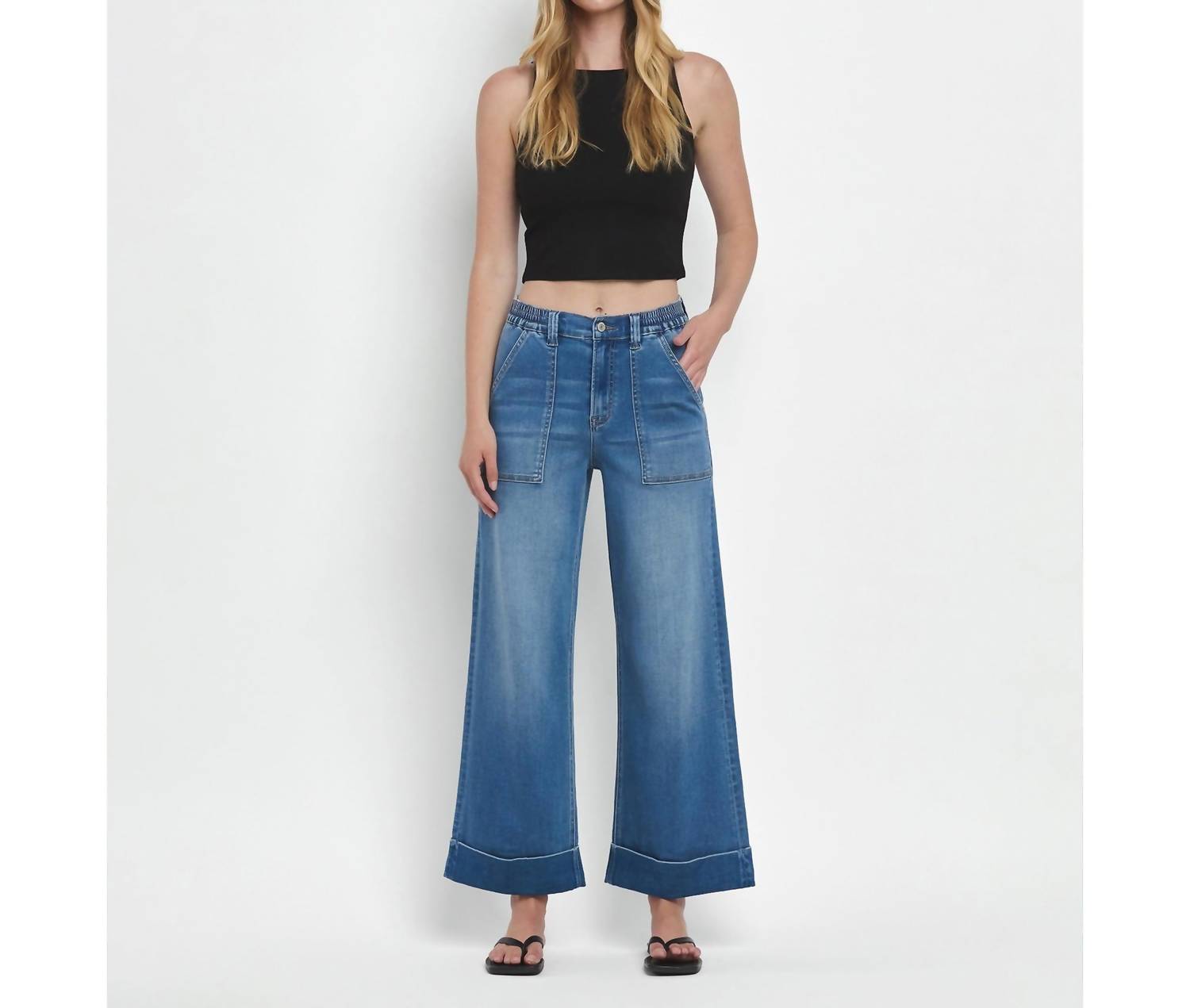 Fit to perfection, we love these high-waist jeans and you will too. Introducing the Enviably High Rise Double Cuffed Baggy Wide Jeans by VERVET BY FLYING MONKEY, designed to elevate your style with their high rise waist and comfort stretch denim. These cropped length jeans feature a wide leg silhouette, complete with a distinctive double cuff hem. Crafted with 57% Cotton, 35% Modal, 7% Polyester, and 1% Spandex, these jeans ensure both comfort and style, finished with a zip closure. Care instructions recommend machine washing and laying flat to dry, while the dimensions include a 10.5" rise, 27" inseam, 22" leg opening, and a 2.5" cuff. Model is 5'10" and wearing size 26.