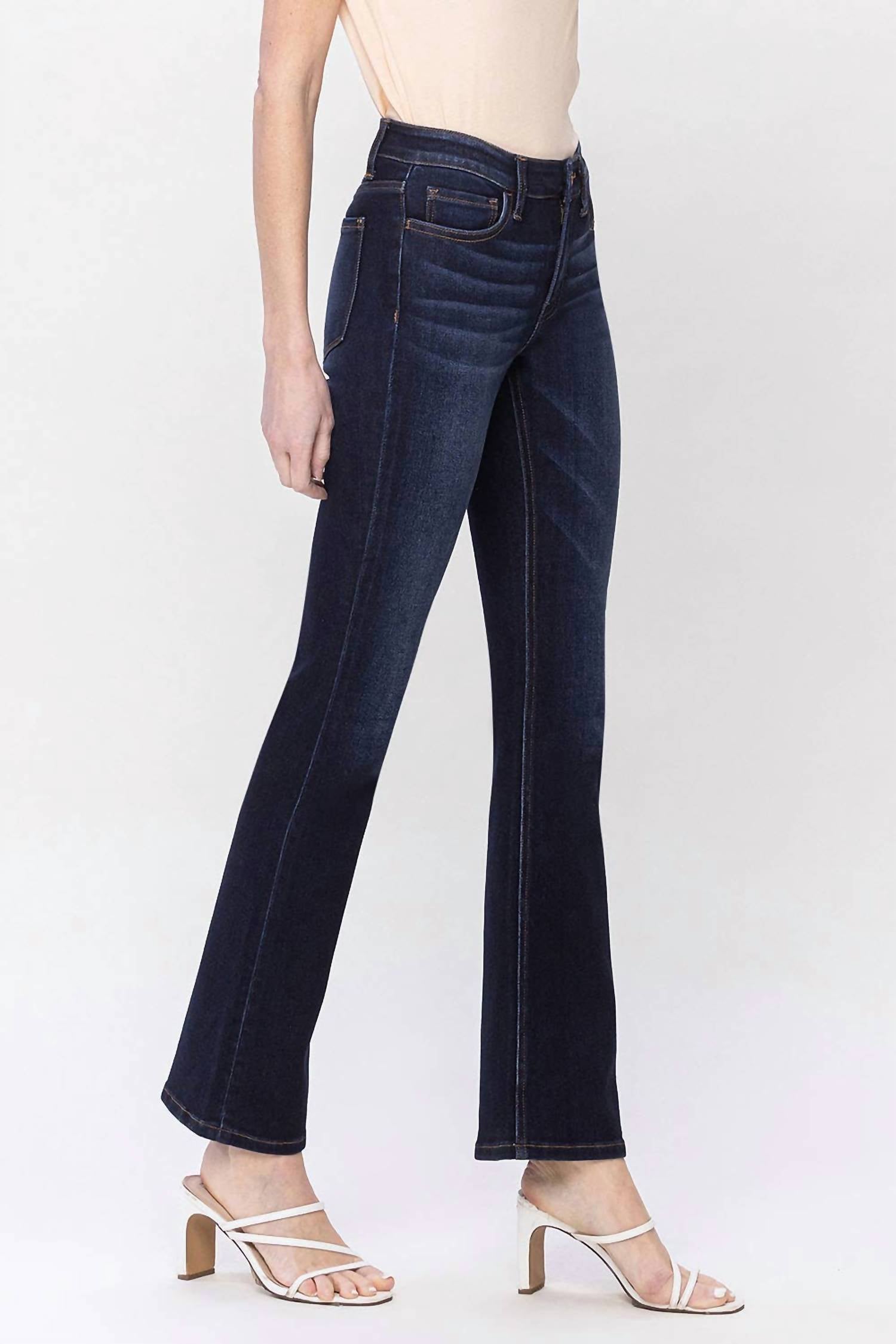 If you're looking for boot-cut, this is the jean for you. Introducing the Jubilee Mid-rise Bootcut Jeans by VERVET BY FLYING MONKEY, tailored for the perfect blend of comfort and style. These dark denim jeans feature a textured pattern and bootcut leg, with a mid-rise fit at 9 inches. Designed with an inseam of 32 inches, they elegantly reach ankle length, accommodating a range of heights. Experience classic denim fashion with the versatility and appeal of these jeans, equipped with pockets for convenience. Model is 5'9" wearing size 26.