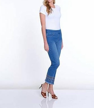 Slimsation By Multiples - Pull-on Solid Denim Ankle Jean With Embroidered Hem