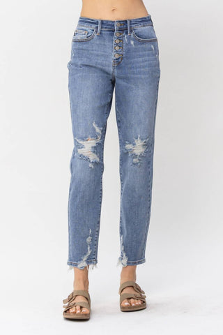 Judy Blue - High Waist Button Fly Destroyed Boyfriend Denim Jeans