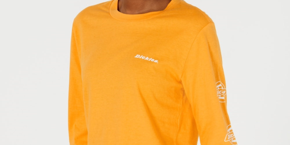 Hits at hip; approx. 19 long|Crew neckline|Dickies logo at chest; sleeves and back|All cotton|Machine washable