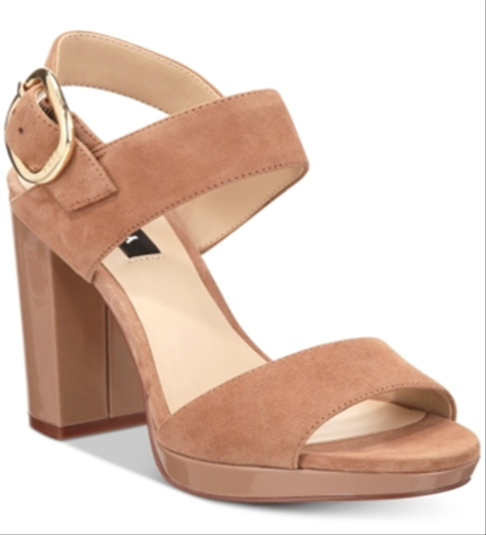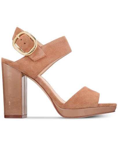 Elevated on a towering block heel| DKNY 's chic Bell sandals secure with a stylish slingback and statement buckle. | 4 block heel| 1/2 platform| Almond-toe sandals with slingback strap and buckle closure| Suede upper; manmade sole| Imported