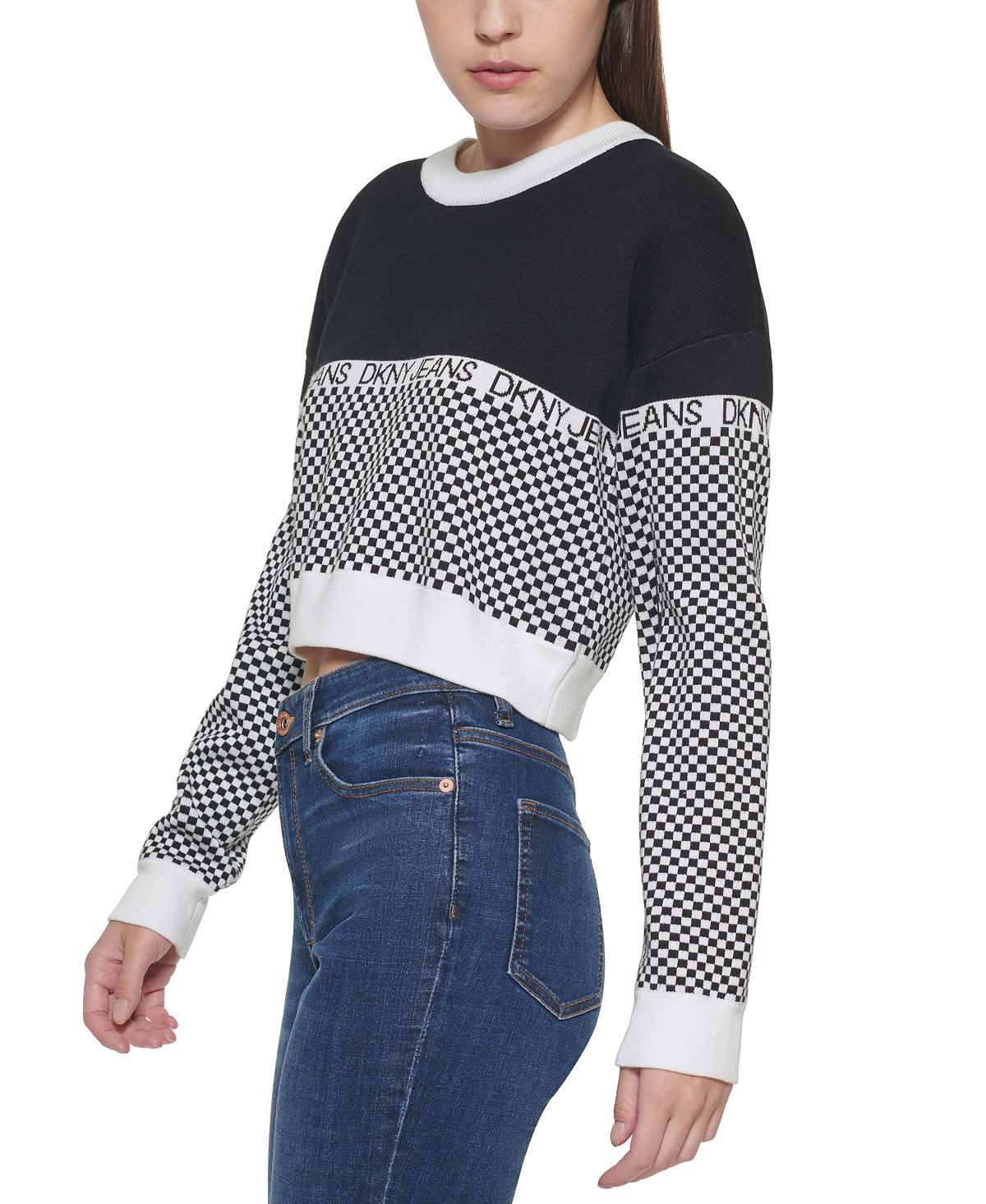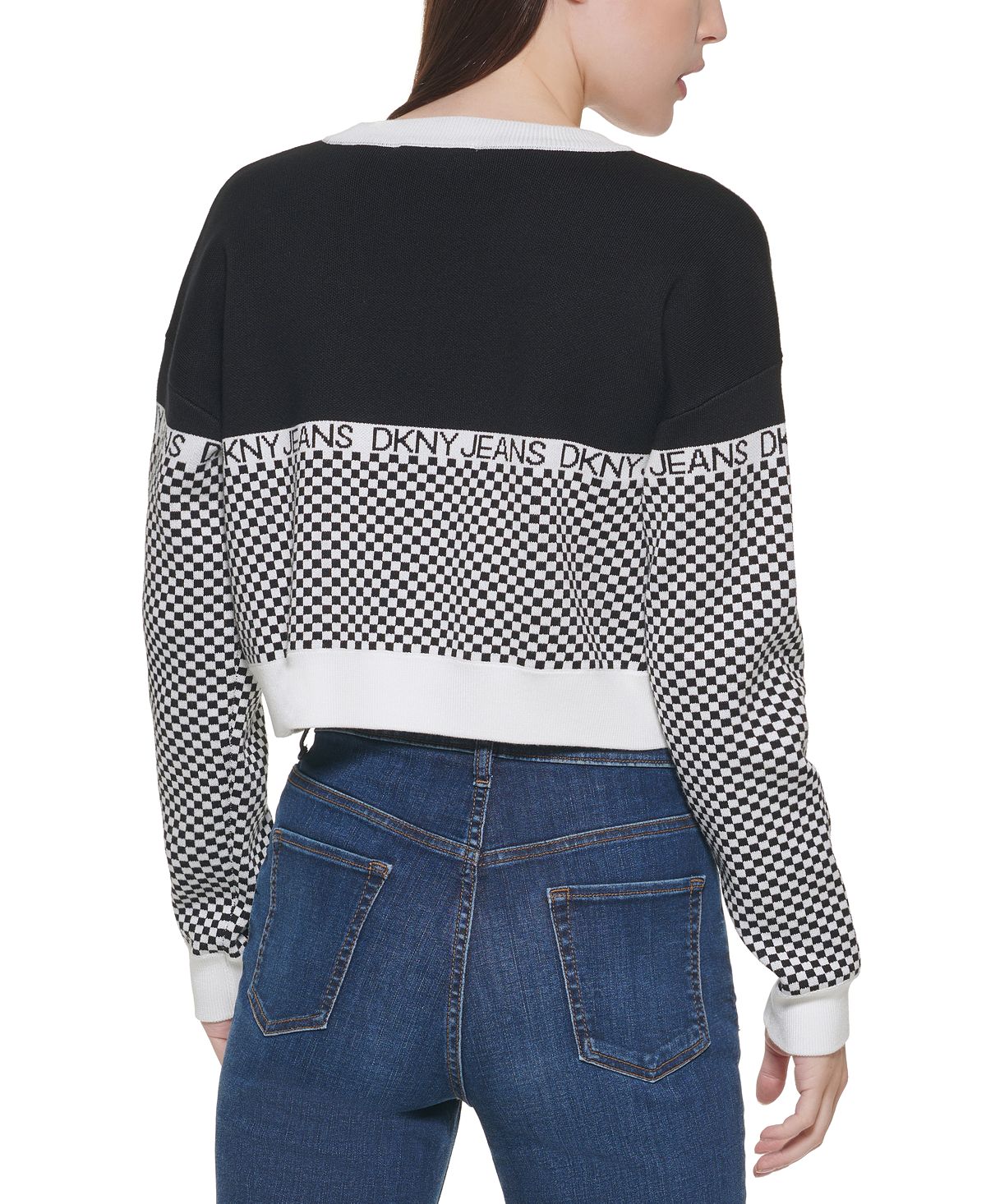 Cut for optimal comfort and easy layering| this DKNY sweater is complete with a flowing silhouette| and checkered logo design.| Approx. 19 long| Crewneck| Cotton/nylon| Machine washable