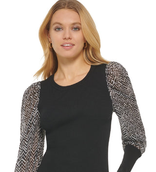 DKNY Women's Printed Mixed Media Long Sleeve Sweater Black Size Small
