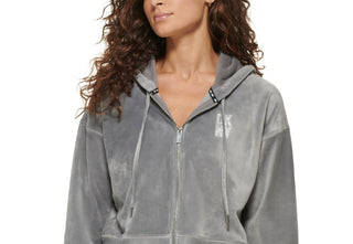 DKNY Women's Velour With Rhinestones Logo Zip Up Hoodie Gray Size X-Large