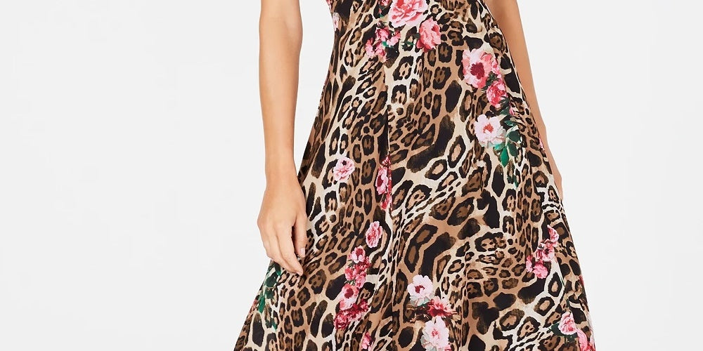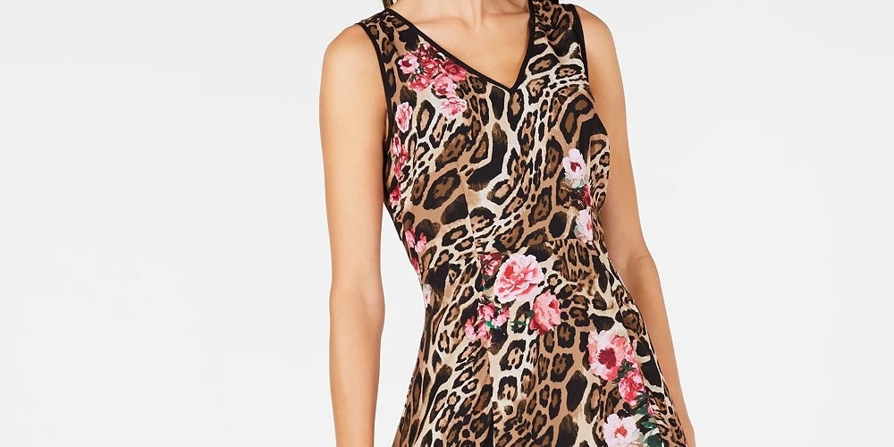 INC International Concepts Women's Beige Printed Sleeveless V Neck Midi Trapeze Dress Gold Size 4