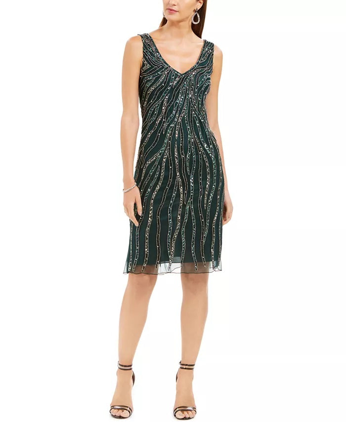 Approx. 39 long from center back neck to hem|V-neck; Sheath silhouette|Pullover styling|Allover beaded and sequin print; V-back|IMPORTANT NOTE; This item arrives with a return tag attached and instructions for removal. Once the tag is removed from the dress; this item cannot be returned.