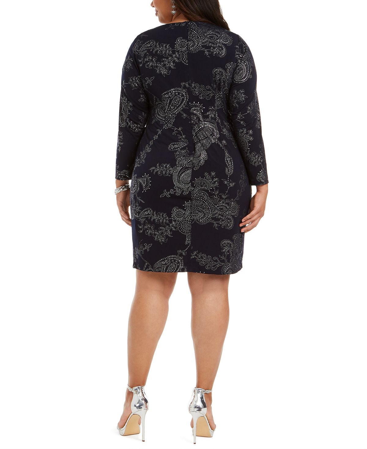 Side-ruched for a flattering fit| Jessica Howard's plus size dress in metallic-accented paisley print will take you from office to evenings.| Approx. 39 long from center back neck to hem. Length is based on a size 14W and varies 1/4 between sizes| Round neckline; sheath silhouette| Hidden zipper closure at center back| 3/4-sleeves