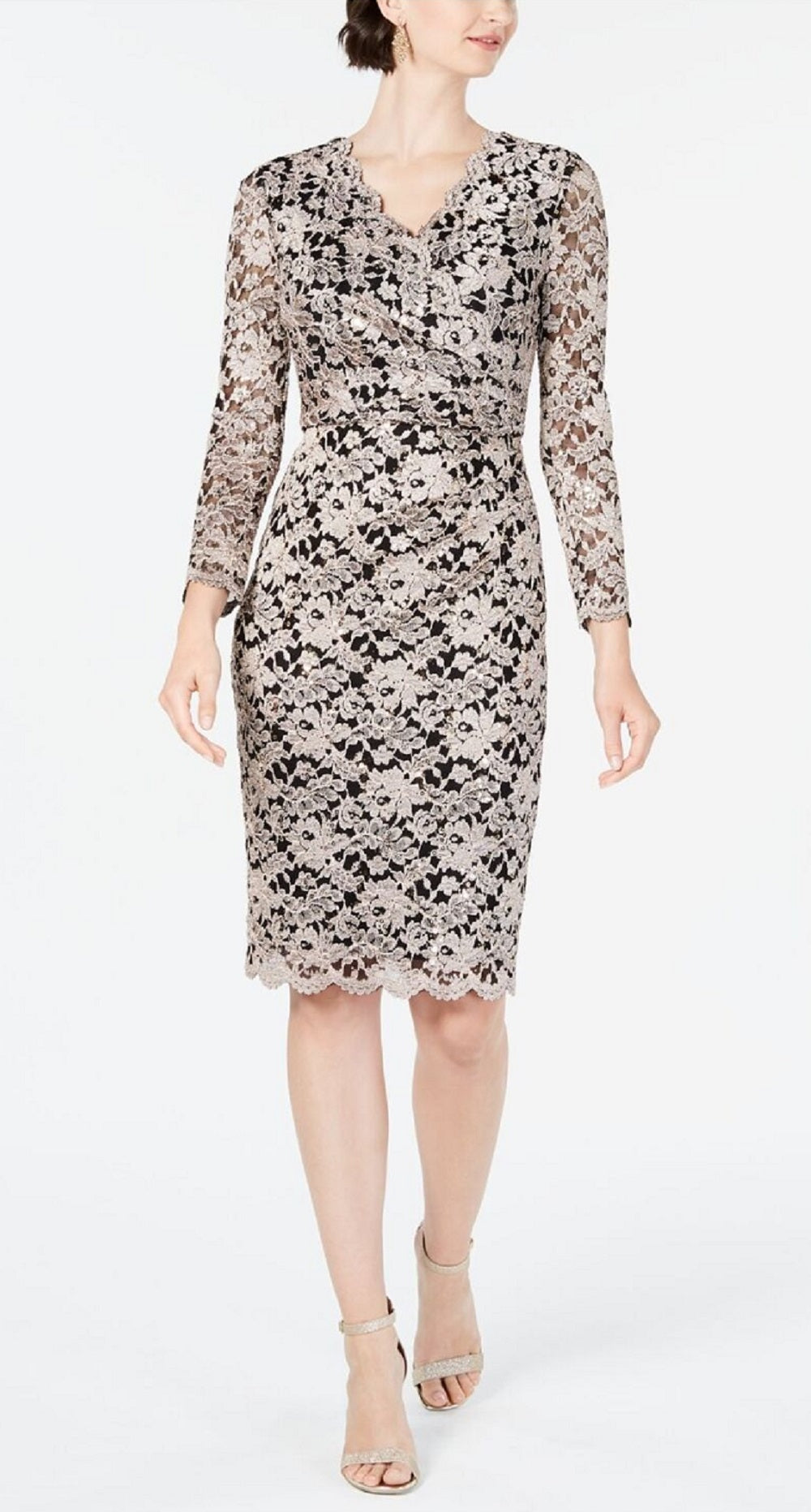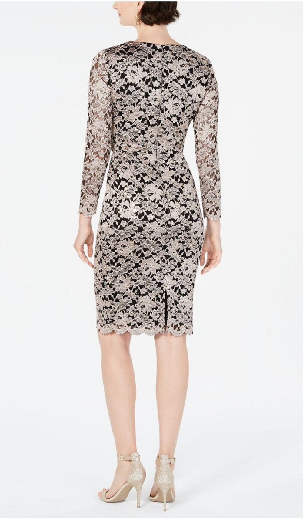 Look elegant at every occasion in this Jessica Howard sheath dress. The sequined lace catches and reflects the light beautifully.| Approx. 39-3/4 long from center back neck to hem. Length is based on size 6 and varies 1/4 between sizes| Surplice neckline; Sheath silhouette| Hidden back zipper with hook-and-eye closure| Allover sequined lace| IMPORTANT NOTE; This item arrives with a return tag attached and instructions for removal. Once the tag is removed from the dress