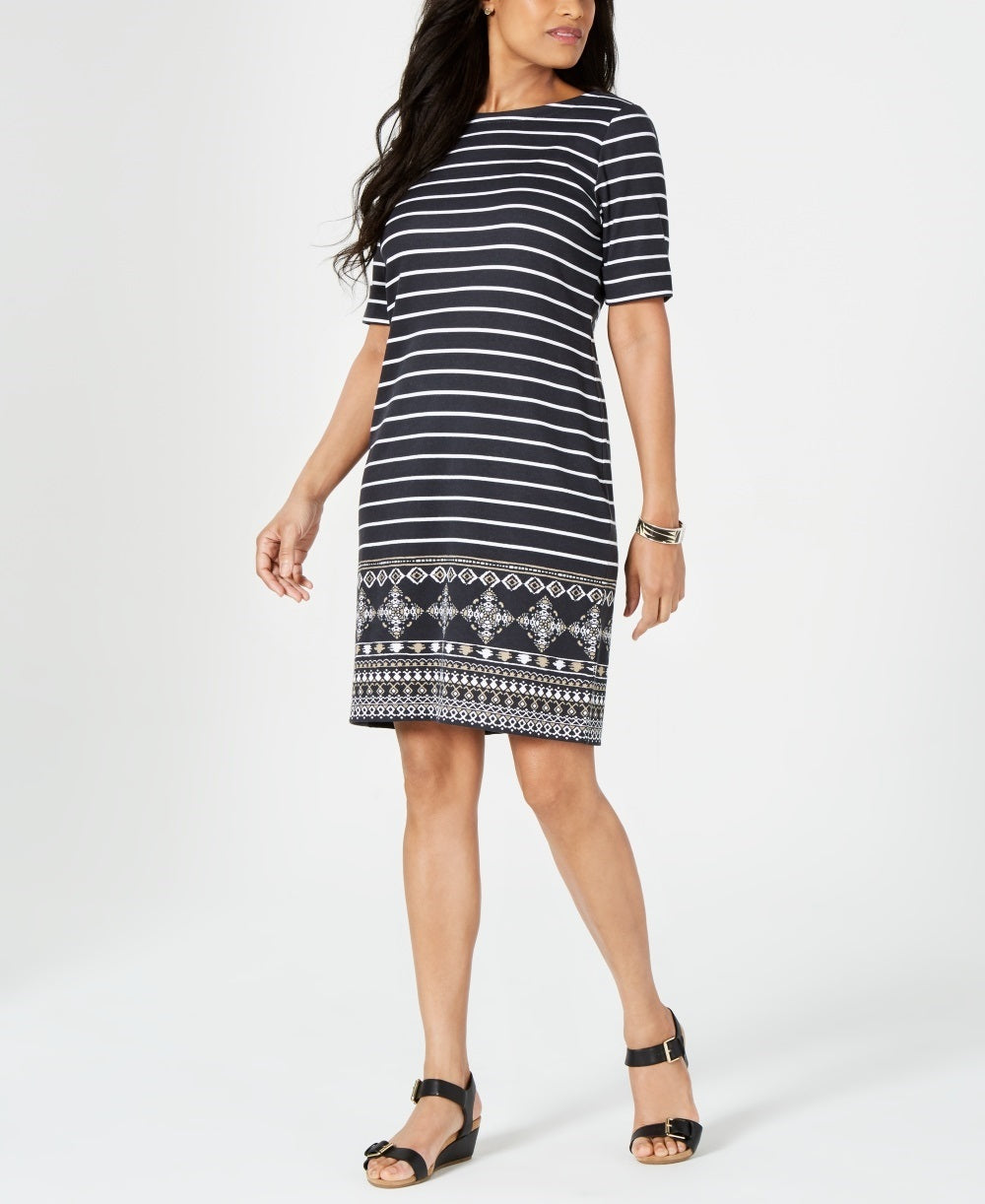 Designed to fit and flatter 5'4" and under frame|Boat neckline; Shift silhouette|Pullover styling|Cotton/polyester|Machine washable