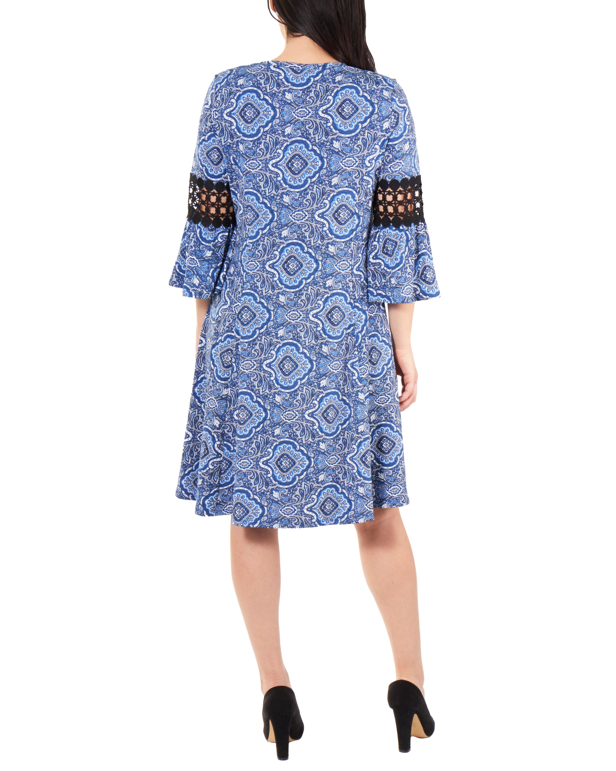 NY Collection Women's Crochet TrimBell Sleeve Dress Blue Size Petite Medium