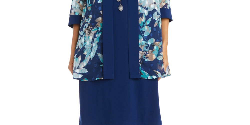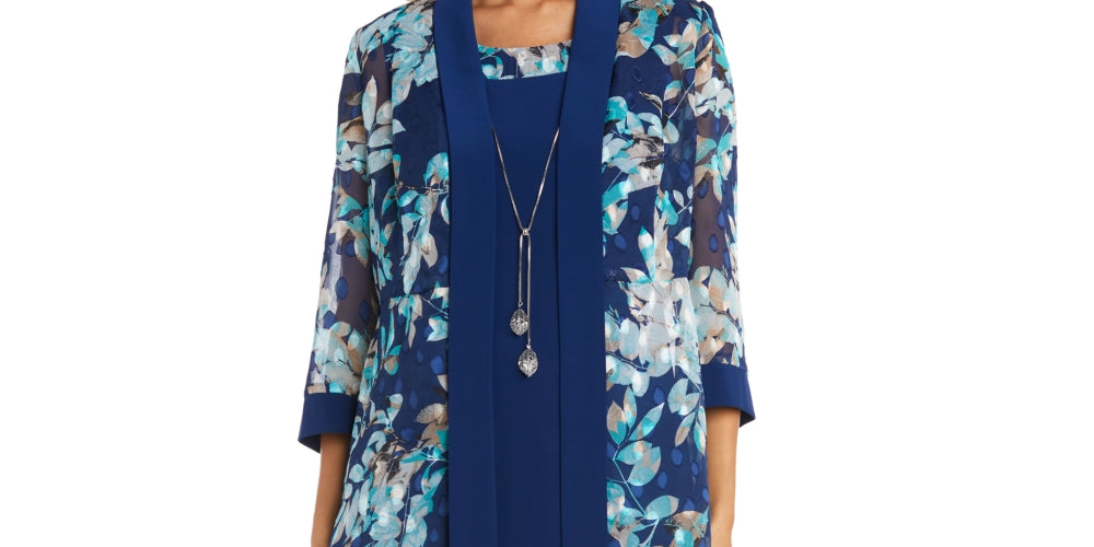 R & M Richards Women's Printed Jacket & Necklace Dress Blue Size 18W