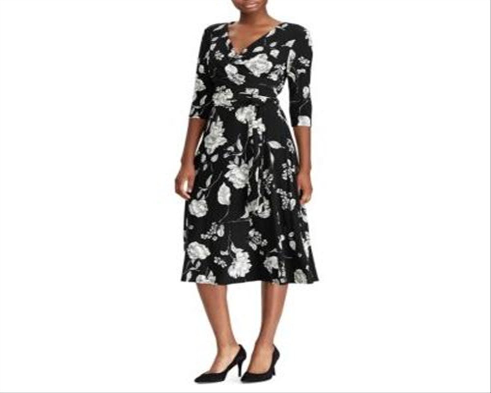 Black & Colonial Cream Floral Surplice Fit & Flare MIDI Dress - Women| The garden-fresh floral print on this three-quarter sleeves dress will put a spring in your step whether you're dashing to an outdoor event or girl's brunch| Side ruching flatters your figure while the longer length allows you to flit about gracefully| Size 8; 47'' long from high point of shoulder to hemPull onLinedPolyester / elastaneMachine washImported