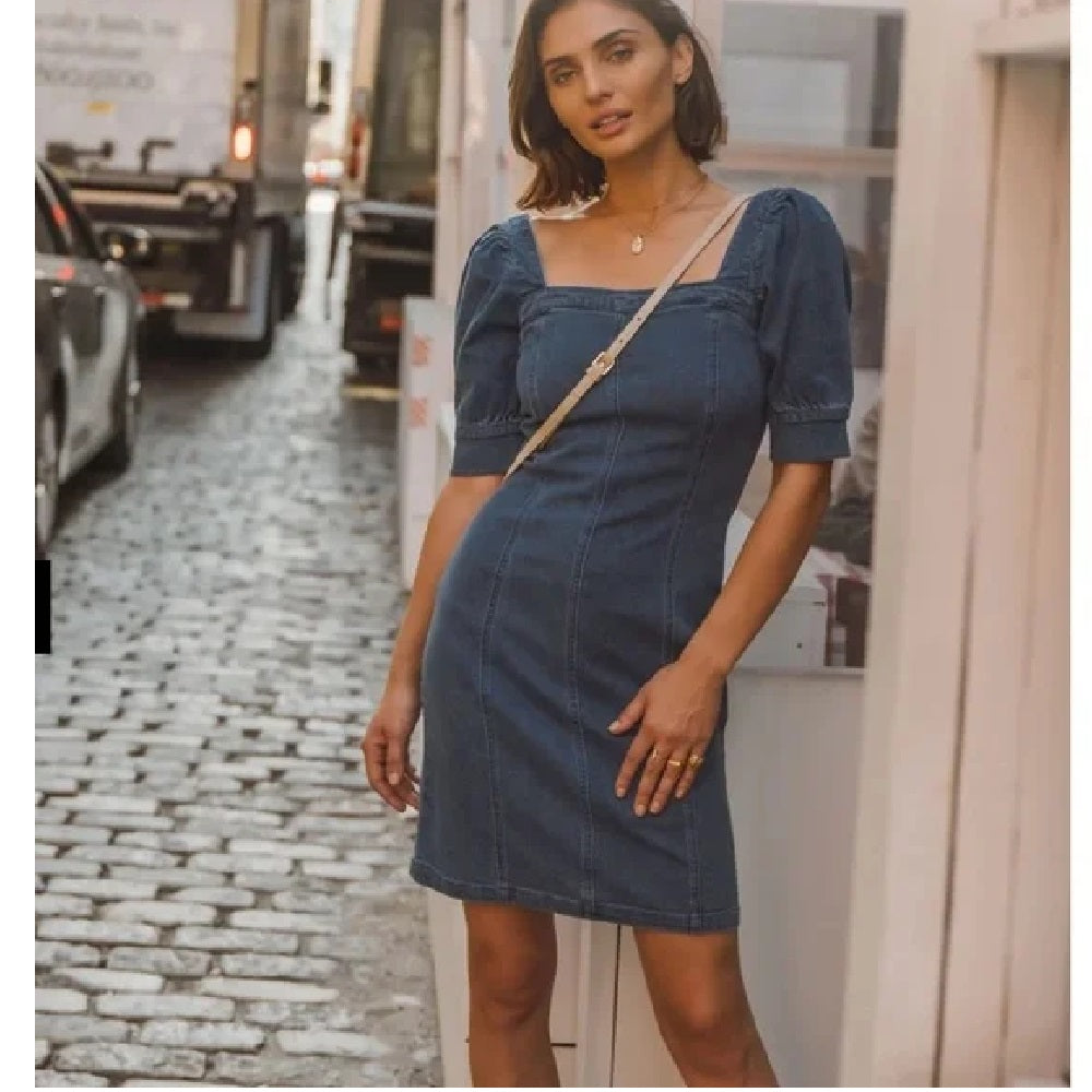 Denim Dress Mini Length Square Neck Short Puff Sleeves Two Snap Button Closure on Cuffs| Non-Elastic Cuffs Back Zipper Closure Bodycon Style Non-Stretch Material 99% Cotton| 1% Spandex Machine Wash Cold|5 Large (10-12) 36 36 X-Large (14-16) 38 36|5 Our online merchandise team measures each size by hand| For more specific information on the product