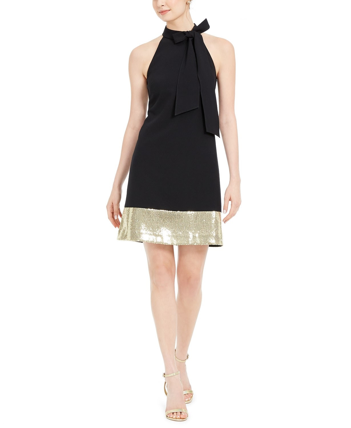 Approx. model height is 5'10" and she is wearing a size 6|Approx. 36-1/2" long from center back neck to hem. Length is based on size 6 and varies 1/4" between sizes|High neckline; Shift silhouette|Hidden back zipper closure; tie detail at neckline|Embellished hem|Polyester/spandex; lining: polyester|Dry clean