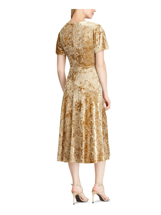 Ralph Lauren Women's Velvet Short Sleeve V Neck Below The Knee Evening Fit Flare Dress Yellow Size 8