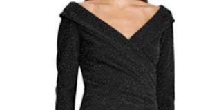 Ralph Lauren Women's Gathered Glitter Long Sleeve V Neck Below The Knee Sheath Evening Dress Black Size 4