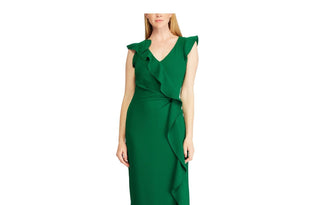 Ralph Lauren Women's Ruffled Zippered Petal Sleeve V Neck Full Length Evening Ruffled Dress Green Size 8