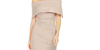 Vince Camuto Women's Glitter Zippered Short Sleeve Off Shoulder Below The Knee Sheath Evening Dress Brown Size 14