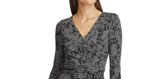 Ralph Lauren Women's Floral 3/4 Sleeve V Neck Below The Knee Fit + Flare Dress Gray Size 2 Petite
