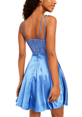 City Studios Women's Lace Spaghetti Strap V Neck Short Fit Flare Evening Dress Blue Size 5