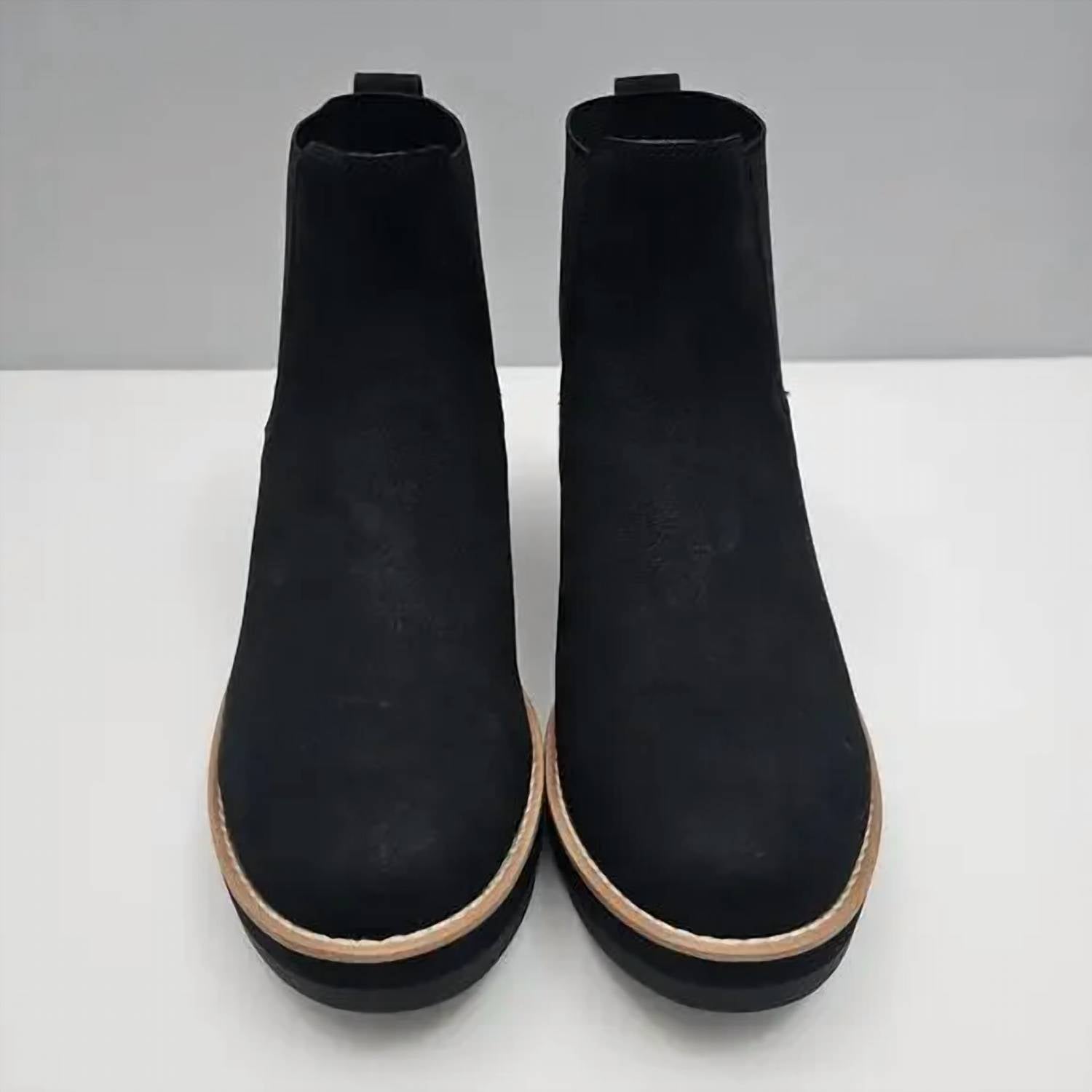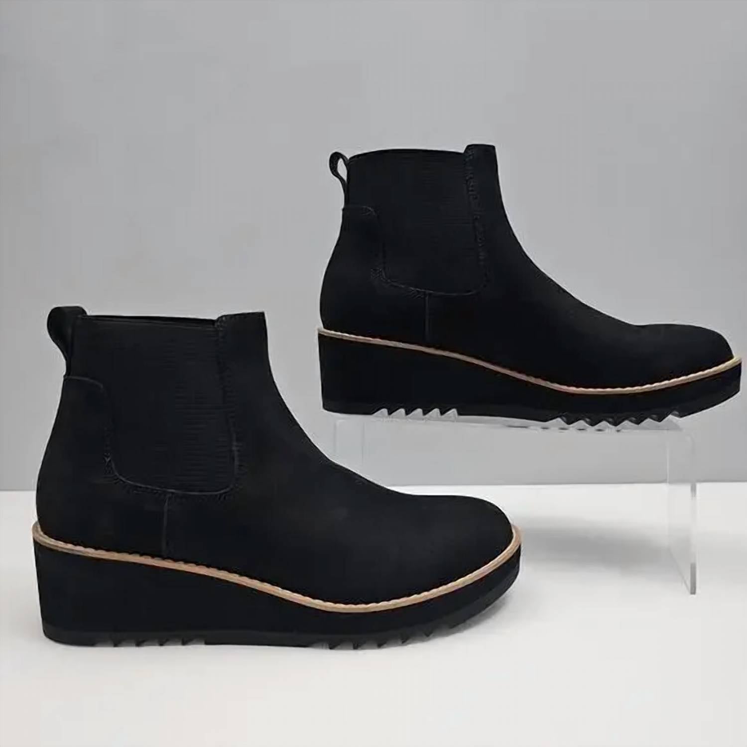 A stylish boot with a comfortable fit and the perfect amount of height. These classic boots are the perfect addition to any outfit and can be worn season after season. Step confidently into style with the Eileen Fisher Chelsea Suede Wedge Boots, crafted in sleek black nubuck leather. Designed in a pull-on chelsea style, these boots feature elastic side gore panels for easy wear and a comfortable round toe. The boots boast a supportive 2.25" wedge heel and are equipped with a synthetic lug outsole for added traction. The 4.5" shaft and 10.25" leg opening ensure a perfect fit while the textile lining and lightly cushioned footbed keep your feet cozy all day.